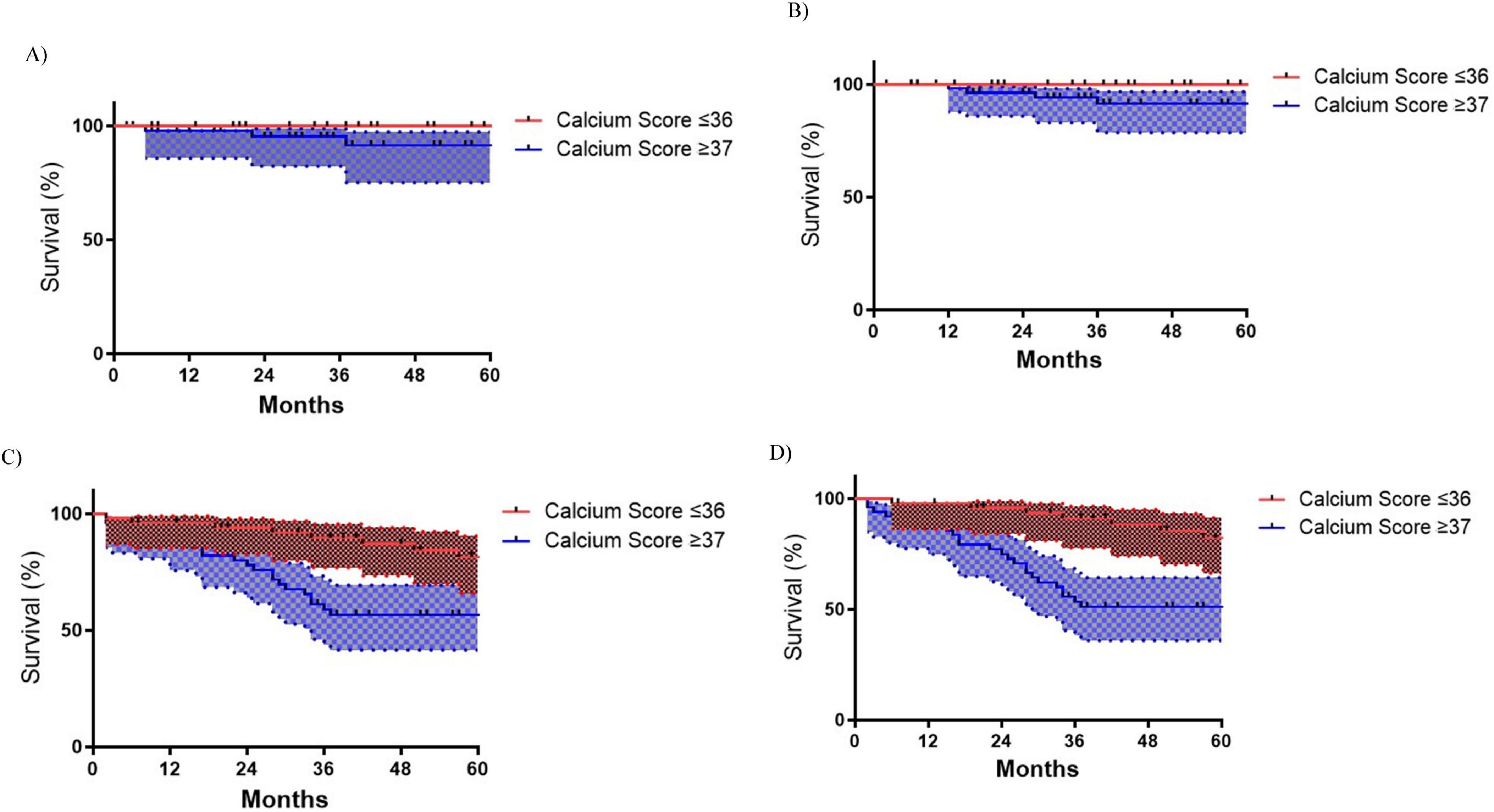 Regarding amputation, this study data showed robust association with a significantly lower major amputation-free survival in patients with calcium scores ≥ 37 (74.5% vs. 97.8% at 60 months; log-rank p = 0.002), in agreement with previous studies linking extensive calcification to worse limb outcomes, albeit some exceeding rates likely reflecting our cohort’s critical ischemia severity. For instance, Huang et al. (8) reported a 2.88-fold increased risk of amputation in patients in the highest calcium score quartile (95% CI 1.18–12.72; p = 0.03), and Kang et al. (10) found that patients with extensive tibial calcification had significantly lower 2 years amputation-free survival (Extensive Calcification: 58.9% vs. Minimal Calcification: 79.0% vs. Intermediate Calcification: 95.3%; p < 0.001), with extensive calcification being an independent predictor (HR 9.90; 95% CI 2.05–47.75; p = 0.004). Similarly, Dong et al. (28) identified tibial artery annular calcification as an independent predictor of unplanned amputation (HR 3.74; 95% CI 1.71–8.19; p = 0.001), reinforcing the importance of the calcification pattern.