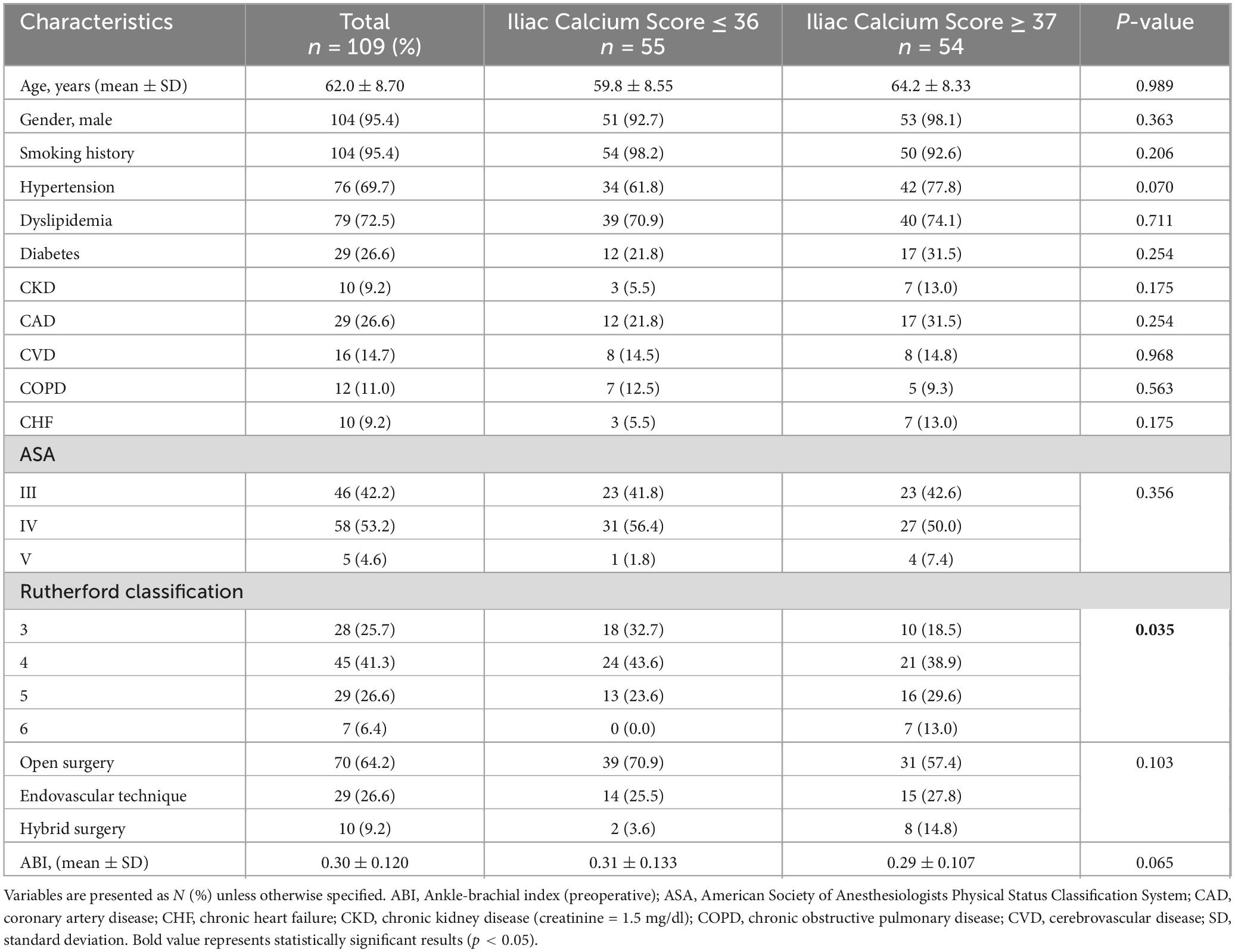 This study has several important limitations. Although it was conducted across two centers — a large academic institution and a community referral hospital, which enhances external validity — the sample size remains relatively small. Additionally, the marked predominance of male patients (95.4%) significantly limits the generalizability of findings to the broader population, particularly to women. To mitigate potential selection bias arising from the inclusion of only patients with available CT imaging, a sensitivity analysis was performed (Supplementary Table 1). Second, the post hoc design introduces inherent limitations, including the possibility of selection bias: patients with significant comorbidities or unfavorable clinical status may have been more likely to undergo less invasive procedures or to be excluded from revascularization altogether. This is particularly relevant given that current guidelines recommend open surgery for healthier patients with extensive aortoiliac disease. At the same time, an endovascular-first approach is often favored in those with higher operative risk (33). Third, although significant associations were found between calcium scores and clinical outcomes, causality cannot be established due to the study’s observational nature. In addition, variability in the measurement of calcium scores may have influenced patient classification into high-score vs. low-score groups, and absolute score values are known to be affected by age, sex, and ethnicity—factors not fully controlled for in this cohort, despite the limited ethnic diversity in the region. Finally, the pattern of arterial calcification was not evaluated (intima layer vs. media layer) or specific morphological features such as circumferential characteristics or thickness of the artery, which recent studies have identified as potentially relevant predictors of outcomes (28, 29).