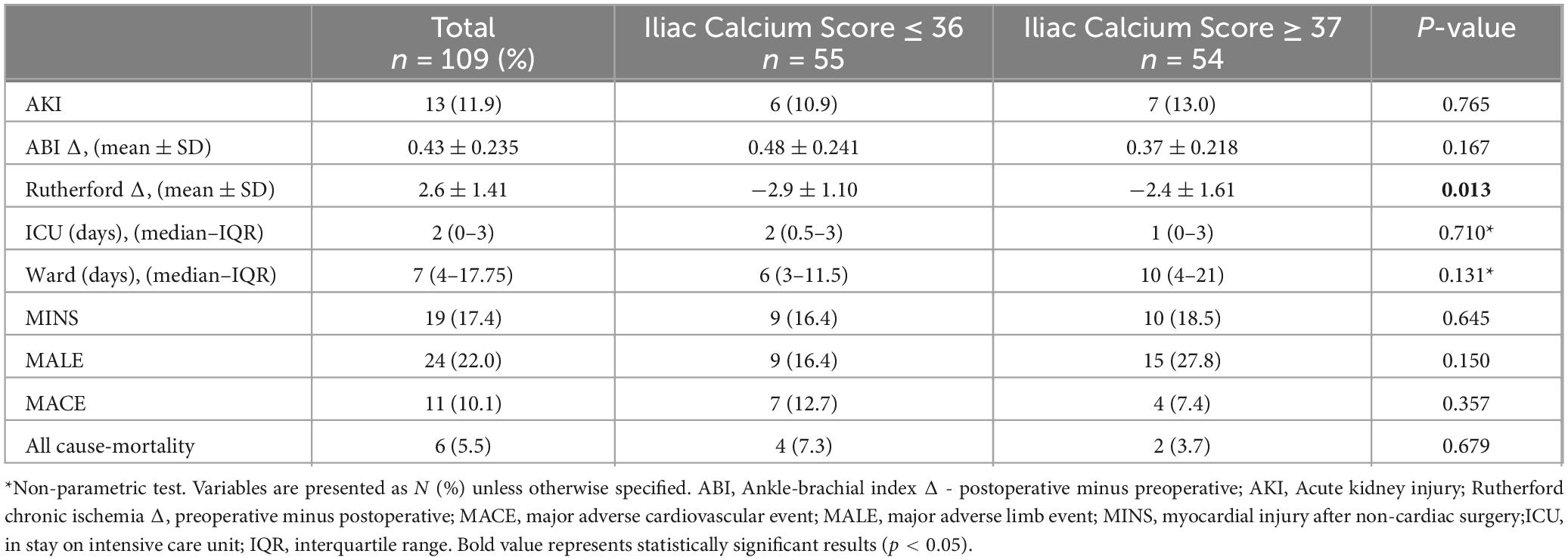At 30 days follow-up, the cohort with higher calcification score demonstrated attenuated improvement in Rutherford classification post-revascularization, with no significant differences in other limb-related outcomes or adverse cardiovascular events. These results are partially consistent with those of Megale et al. (12), who also reported no significant association between aortic calcium scores and 30 days mortality (p = 0.679), patency (p = 0.167), or technical success (p = 0.103) across 14 interventions in 11 patients. However, in contrast to our findings, Megale et al. observed a significantly higher calcium score in patients who required amputation (5,767.6 vs. 805.3; p = 0.02) or underwent subsequent revascularization (3,686.8 vs. 645.2; p = 0.008) within 30 days. These comparisons suggest that while calcification burden may influence early clinical recovery, its association with short-term major events remains inconsistent.