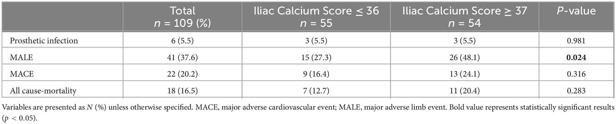 In terms of MALE, a significantly higher incidence was observed at 1 year in patients with higher calcium scores (48.1% vs. 27.3%; p = 0.024), although this association did not remain significant in adjusted analysis. These results likely reflect the persistent significance of major amputations over time, while the lack of sustained differences in primary/secondary patency rates may have diluted the composite MALE outcome’s statistical significance in adjusted models. This suggests that calcification’s strongest prognostic impact, measured through ICS, lies in irreversible limb loss rather than revascularization-dependent endpoints in the aortoiliac population, and since distal vessel disease were not systematically included in the analysis, ICS may serve as a reflection of the overall systemic arterial calcification burden, including in the lower limbs. This trend is supported by findings from Megale et al., where higher below-the-knee calcium scores were associated with MALE both at 30 days (679.4 vs. 158.9; p = 0.019) and 1 year (910.1 vs. 12.3; p = 0.002) (12).