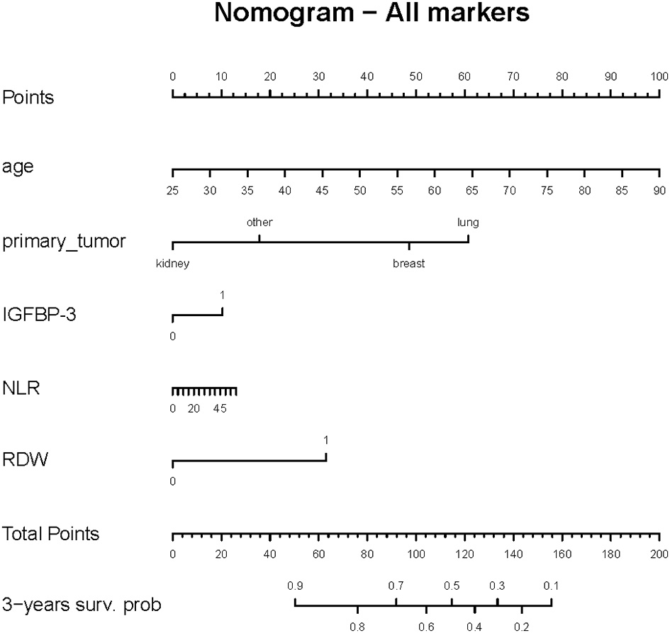 Categorical variables (sex, smoking, HBP, hypothyroidism, dyslipidemia, diabetes, bone metabolism drugs, surgery, bone metastatic site, presence of other metastasis, presence of other tumors, chemotherapy, radiotherapy, AWD, DWD) were summarized with relative frequencies, while continuous variables (age, BMI, survival time, hematological and inflammatory markers) were summarized with mean and standard deviation. A Fisher's exact test was carried out to compare the frequency distribution of the categorical variables among tumor types, while an analysis of variance was used to evaluate the same distribution for the continuous variables. A multivariate Cox proportional hazards model was fitted to evaluate the impact of clinical variables (sex, age, tumor site (humerus, rachis, other), type of surgery (prosthesis, other), primary tumor type (kidney, lung, other), presence of non-BMs, other BMs, and time from diagnosis), bone metabolism markers (calcium, BAP, IGFBP-3, osteocalcin, CTX, P1NP, vitamin D, PTH), and inflammatory and hematological markers [albumin, LDH, β2-microglobulin, CRP, hemoglobin (HGB), RDW, neutrophils, NLR, platelets (PLT), platelet-to-lymphocyte ratio (PLR), SIRI, monocytes, WBC count, and HALP] on overall survival. The proportion of missing data was very small; therefore we decided not to proceed with any form of data imputation but to exclude the missing data from the model's design matrix. To facilitate the interpretability of the Cox models, markers (calcium, BAP, IGFB3, osteocalcin, CTX, P1NP, vitamin D, PTH, albumin, LDH, β2-M, CRP, HGB, RDW, neutrophils, PLT, monocytes, WBC, non-bone metastasis, and other BM) were dichotomized (in range vs out of range). To further help healthcare personnel to use the information carried by biomarkers data, we fitted a reduced version of the Cox model, selecting the variables with a bi-directional stepwise procedure base on the Akaike information criterion (AIC). This reduced model was depicted in a nomogram, that is a visual representation of the model. In a nomogram, we can represent each covariate with its own scale, and each scale translates the value of its covariate into a certain number of points. These points reflect how much that covariate contributes to the final prediction. Summing the point values for all covariates provides the predicted survival probability. Therefore, the nomogram turns the regression model into a visual system where predictors are displayed as linear scales, points quantify their effects and the sum of points correspond to the final prediction. A cut-off of 0.05 for p-values was chosen to indicate statistically significant findings. The statistical analysis was performed using the statistical software R (ver. 4.4.2) (41).