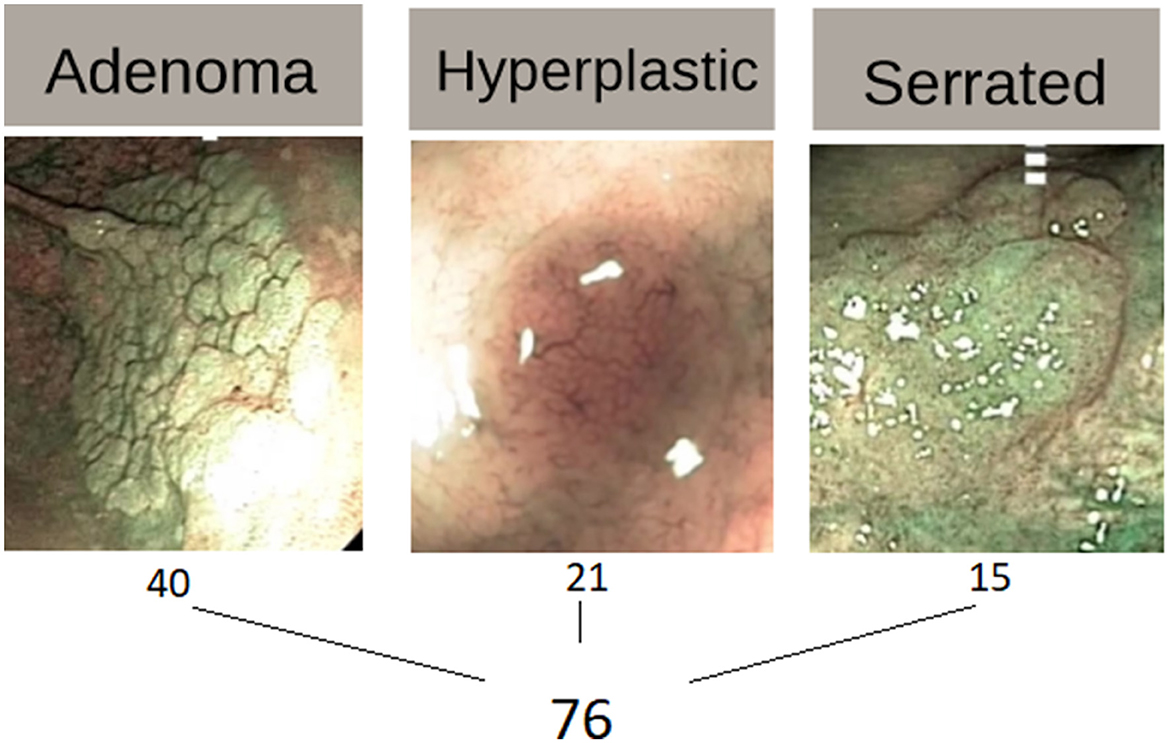 Each type is labeled with its corresponding sample size, totaling 76 polyps across the three categories. This figure was included to clarify the diversity and complexity of the polyp types being analyzed in the study.
