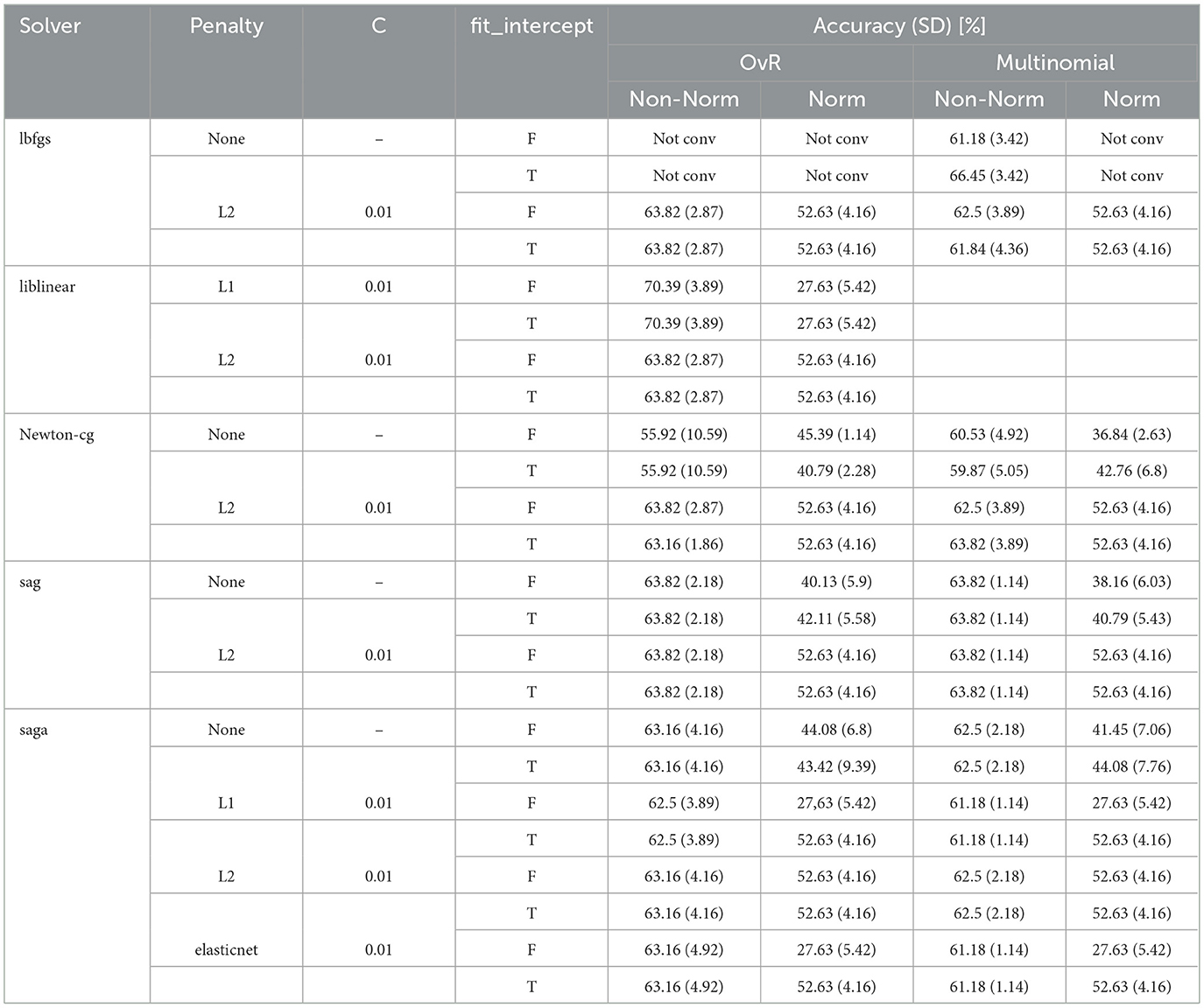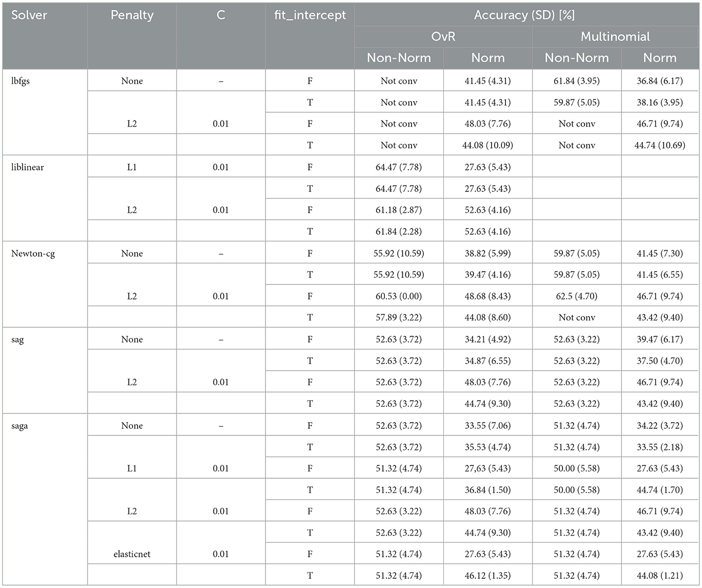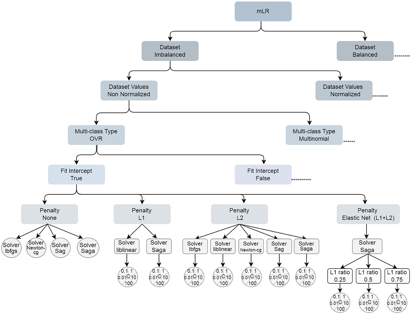 The (lbfgs) (38) solver is an analog of Newton's Method, and the liblinear (39) optimizes the loss function by iterating over each coefficient of the model and adjusting it while the other coefficients are held constant. The newton-cg is a solver that uses the conjugate gradient Newton-Raphson method for optimization, while newton-cholesky solver is a variant of the Newton-Raphson method that uses the Cholesky decomposition to solve the system of equations derived from the Newton-Raphson method. The Sag (40) and saga (a variant of sag) (41) are solvers that use stochastic variants of gradient optimization and they are efficient for large and sparse datasets. Unlike the other solvers, saga supports both L1 and L2 regularization as well as their mixture (ElasticNet).