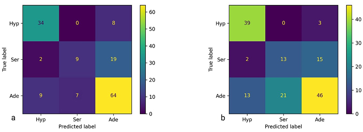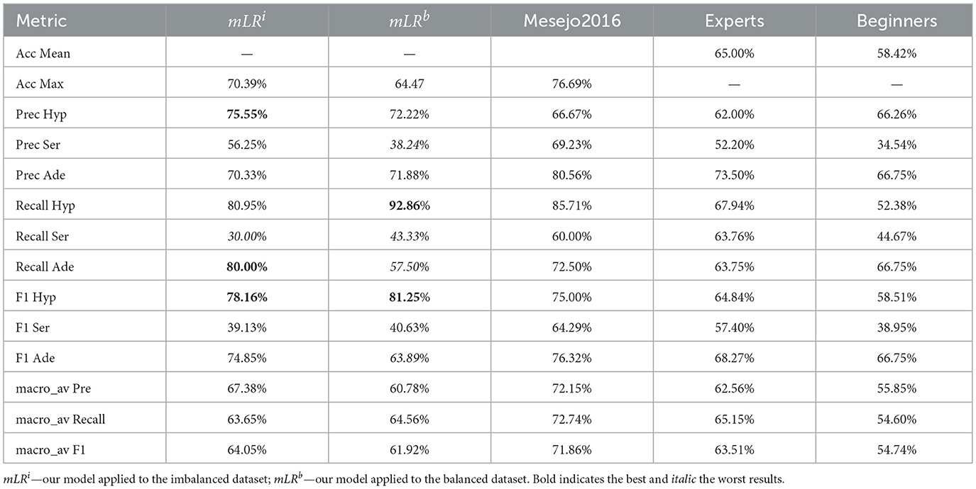 The polyps in this dataset are divided into three categories: 21 hyperplastic, 40 adenoma, and 15 serrated lesions. As part of their everyday protocol, the physicians captured two pictures during colonoscopies using WL and NBI, respectively, for every polyp, they obtained one WL image and one NBI image, resulting in 42 images for hyperplastic, 80 images for adenoma, and 30 for serrated ones. Mesejo et al. (12) extracted 698 features from each image as follows: Amplitude Histogram of Texture (AHT)—166 features; Local Binary Patterns (LBP)—256 features; Color Naming—16 features; Discriminative Color—13 features; Hue—7 features; Opponent—7 features; Color Gray-Level Co-occurrence Matrix (GLCM)—33 features; Surface Signatures with Shape-DNA—100 features; 3D Cloud Signatures with Kernel-Principal Component Analysis (PCA)—100 features. The beginner and expert opinions are only based on endoscopic image data without knowing any other clinical information, meaning that the medical physicians were tested similarly with the same data as the ML algorithms. Figure 1 illustrate example images for each polyp type, providing a visual understanding of their unique structural characteristics.