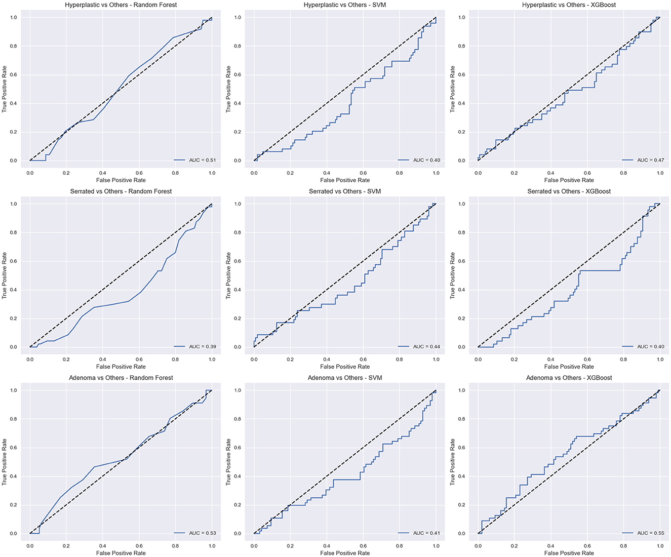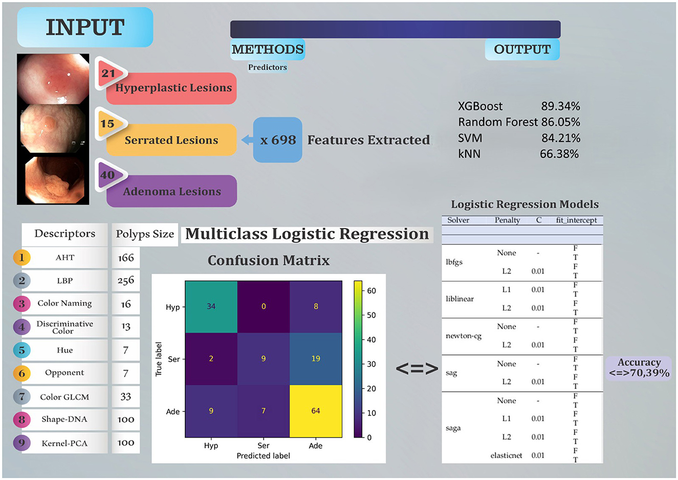 This research used a benchmark dataset of colorectal polyps comprising 152 instances, corresponding to 76 polyps annotated with three lesion types: hyperplastic, serrated, and adenoma. A total of 698 individually made features were extracted from image-level data, including morphological, textural, and intensity-based descriptors. These features served as input for a series of ML classifiers, rather than applying models directly to raw images. Both multiclass and binary methods were used to address the classification task. In addition to Multiclass Logistic Regression (mLR), four state-of-the-art algorithms were implemented and evaluated: Random Forest, k-Nearest Neighbors (kNN), Support Vector Machine (SVM), and eXtreme Gradient Boosting (XGBoost). The comparative analysis focused on macro-average F1-score, lesion-specific metrics as benchmarks.