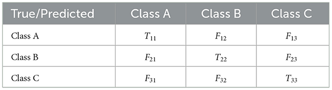 where: (1) Tii are True for class i (A, B, and C, respectively); (2) Fij are False, that is class i is wrongly predicted as belonging to class j.