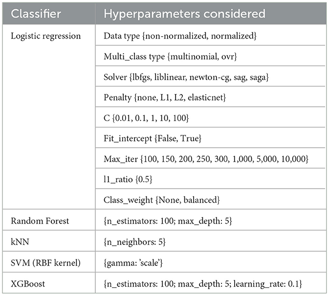Methods: A structured dataset comprising 152 instances and 698 extracted features was used. We conducted a statistical analysis of 88 LR configurations, varying solvers, penalties, and regularization strengths. To improve classification performance, four additional ML algorithms were implemented: k-Nearest Neighbors (kNN), Support Vector Machine (SVM), Random Forest (RF), and XGBoost. For each classifier, parameter tuning was applied using grid search and stratified cross-validation.