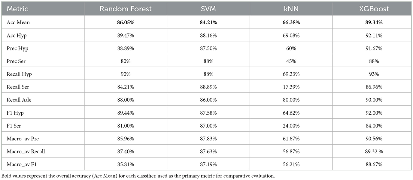 4. Our comparative analysis demonstrated that ensemble methods, particularly XGBoost (macro-average F1-score = 0.88, accuracy = 89%), outperform both traditional classifiers and previously published models such as the Random Forest approach of Mesejo et al. (12, 26).