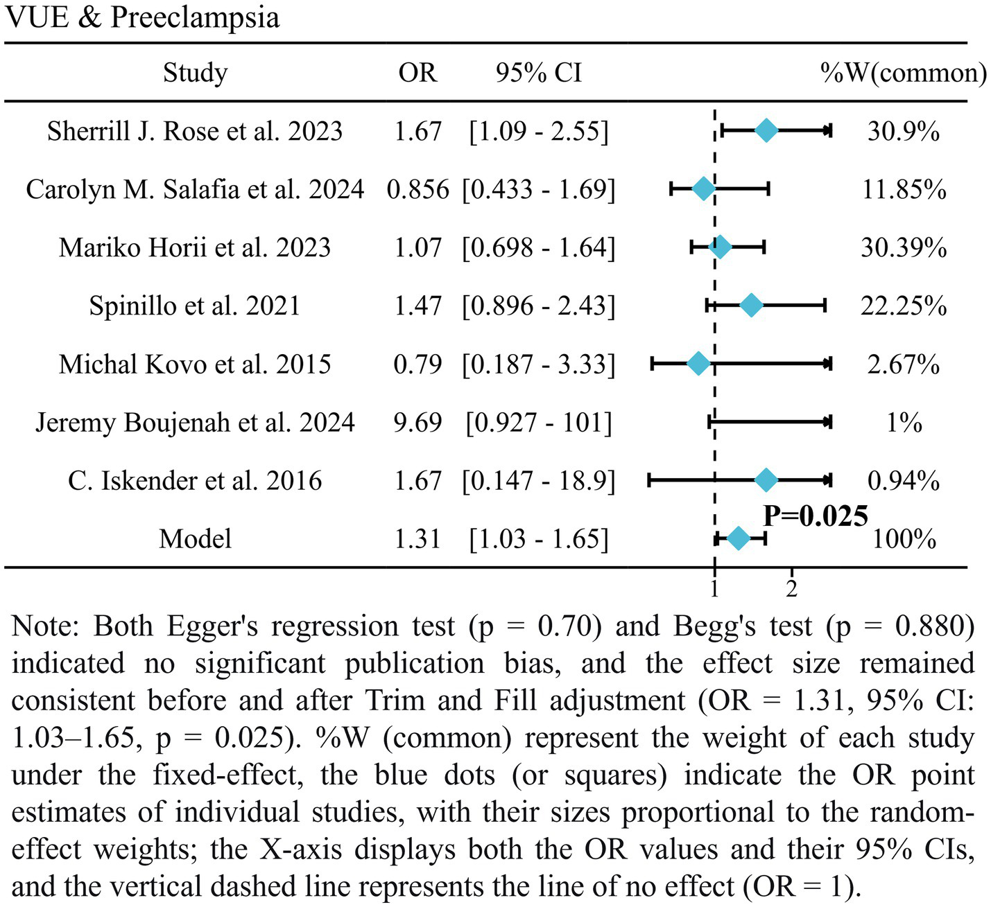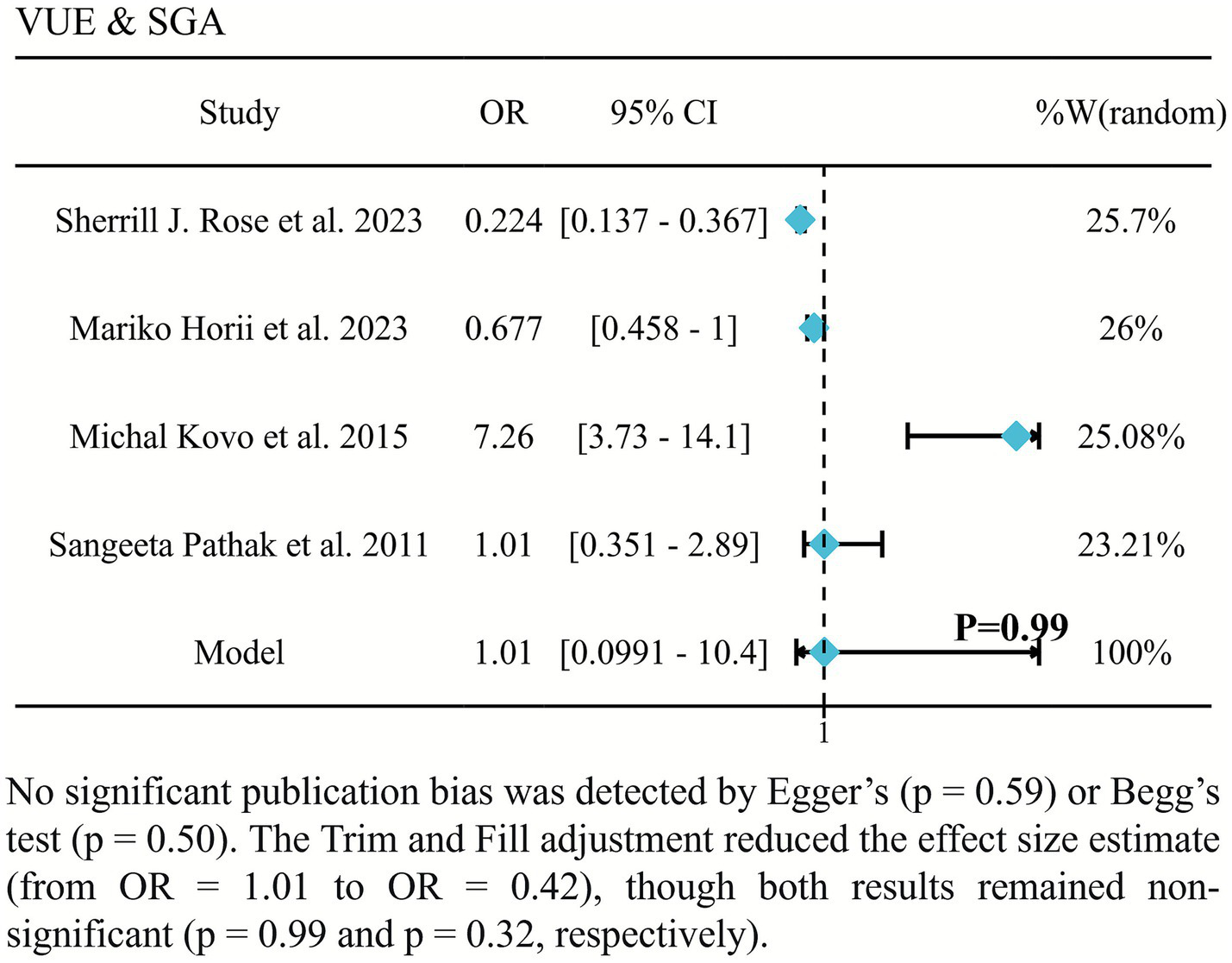 ![Forest plot showing studies on VUE and SGA with odds ratios (OR) and confidence intervals (CI). Sherrill J. Rose et al. 2023: OR 0.224, CI [0.137-0.367]. Mariko Horii et al. 2023: OR 0.677, CI [0.458-1]. Michal Kovo et al. 2015: OR 7.26, CI [3.73-14.1]. Sangeeta Pathak et al. 2011: OR 1.01, CI [0.351-2.89]. Model: OR 1.01, CI [0.0991-10.4], p=0.99. Weights range from 23.21% to 26%. No significant publication bias detected.](https://www.frontiersin.org/files/Articles/1656438/xml-images/fmed-12-1656438-g006.webp)