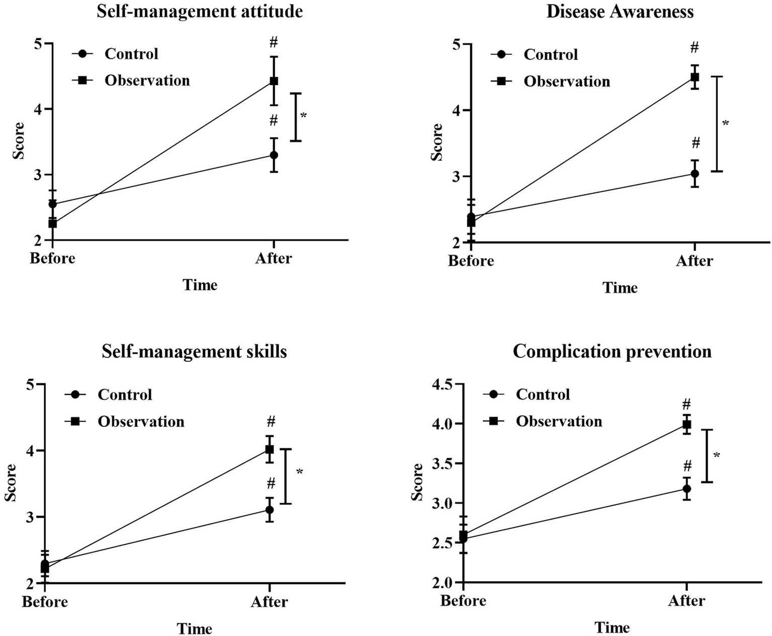 After the PDCA cycle was implemented, the scores of self-management attitude, disease awareness, self-management skills and complication prevention in the observation group were significantly higher than those in the control group (p < 0.05), as shown in Figure 2.