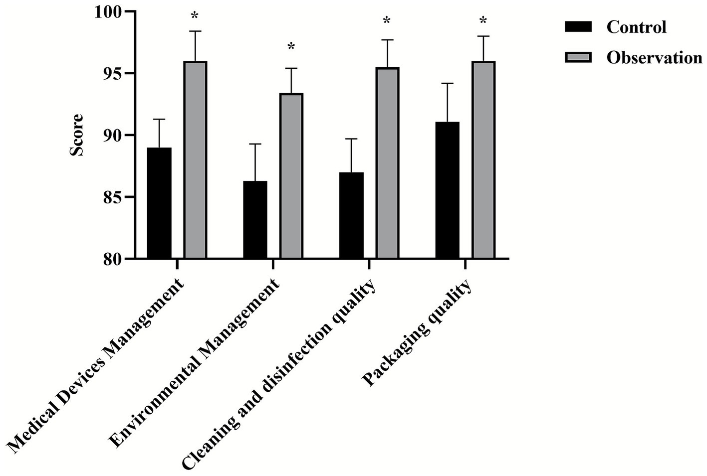 All scores of nursing quality (medical device management, environmental management, cleaning and disinfection quality, packaging quality) in the observation group were higher than those in the control group (p < 0.05), as shown in Figure 3.