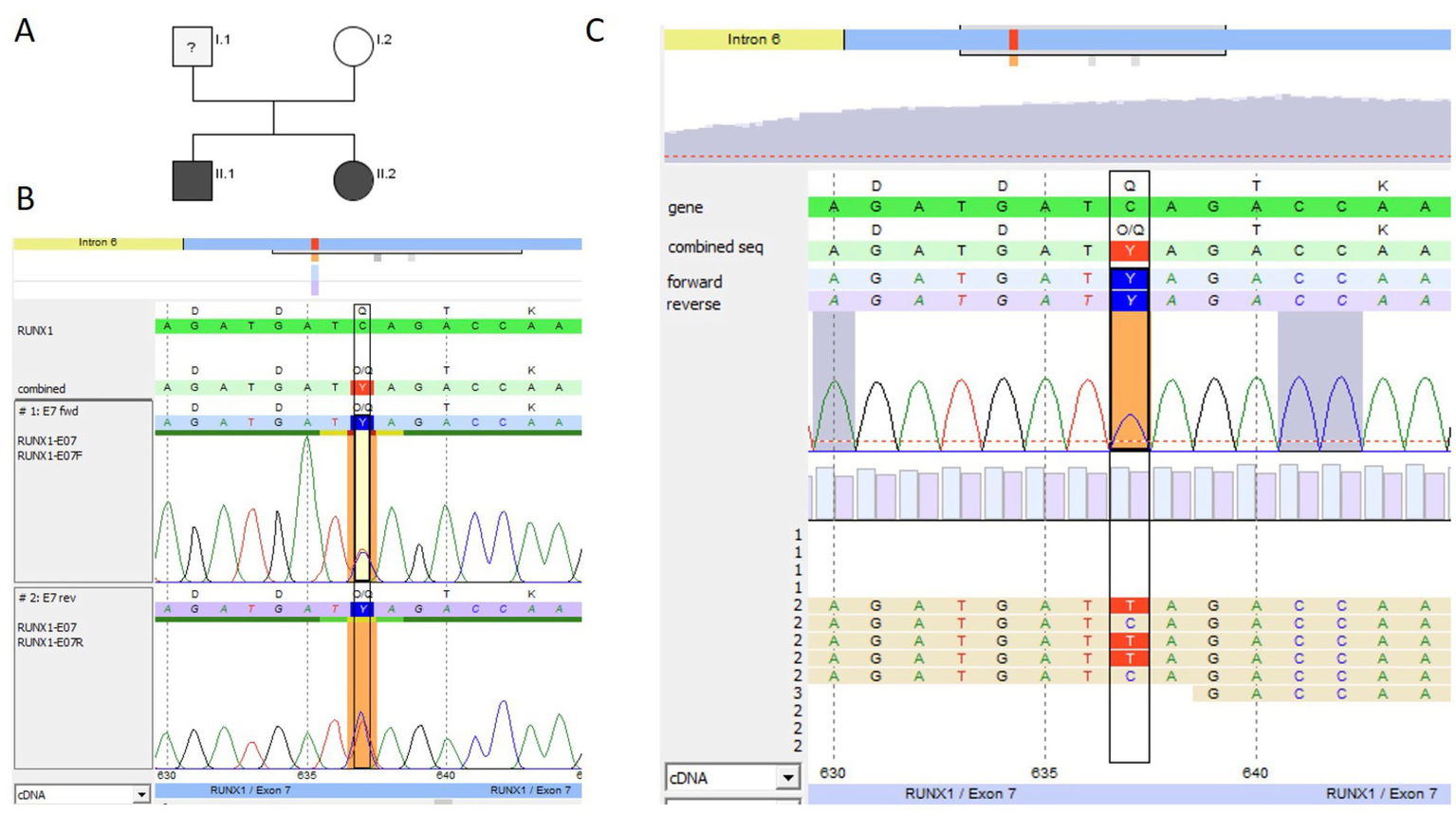 Genetic pedigree and genetic analysis for family 4. (A) Pedigree; black indicates the siblings (II.1 ≙ P4.1 and II.2 ≙ P4.2), both heterozygous carriers of the novel pathogenic RUNX1 (NM_001754.5) non-sense variant c.637C > T p.(Gln213*). NGS panel analysis was performed for both siblings. (B) Sanger sequencing (forward and reverse chromatogram) for the brother P4.1 confirmed the non-sense mutation in RUNX1 identified with panel sequencing. (C) NGS data for the sister P4.2 showing the c.637C > T pathogenic variant (coverage 50% (343) [50% (180) / 50% (163)]) (software SeqPilot®).