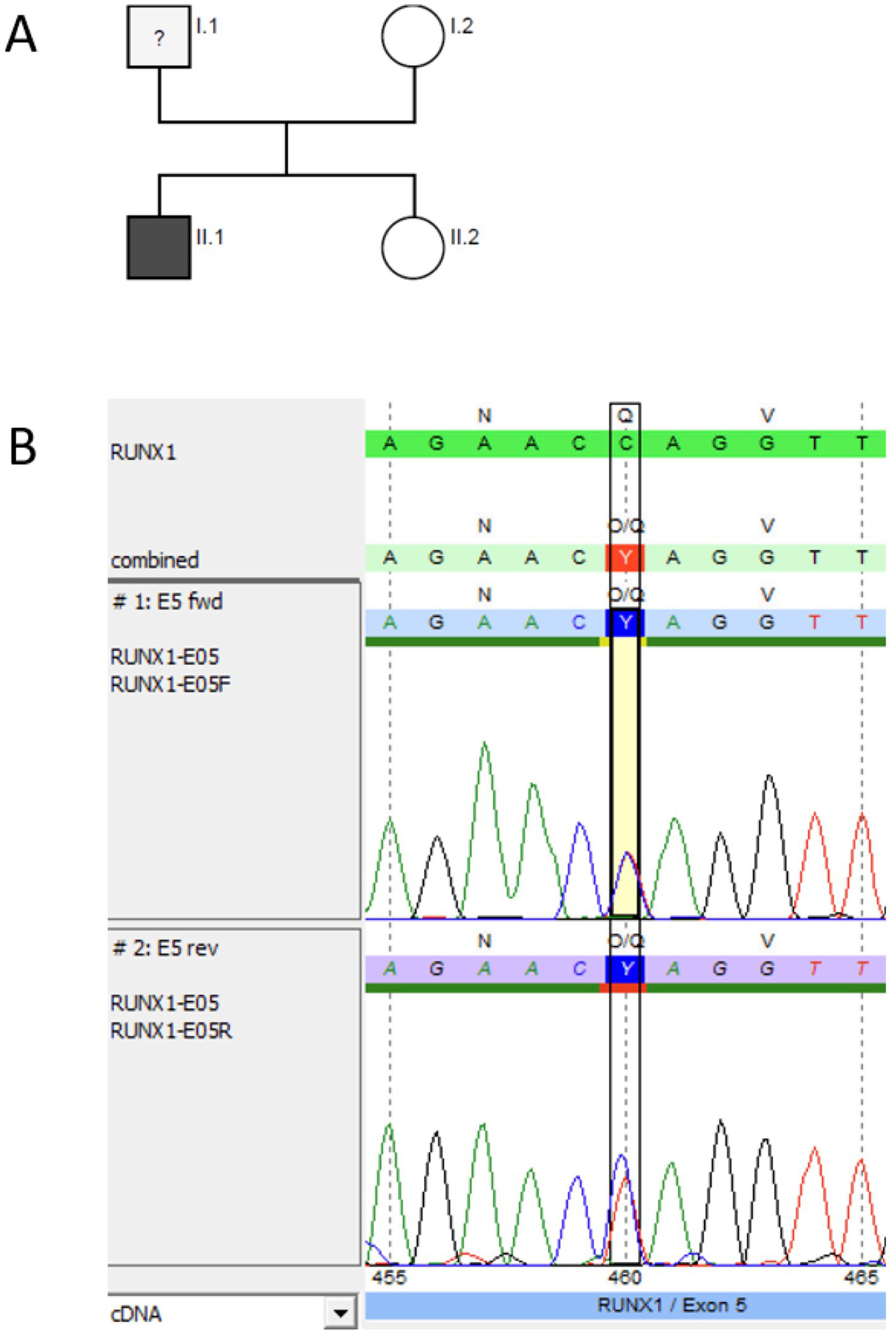 Pedigree and genetic analysis for P5. (A) Genetic pedigree for family 5. (B) Germline testing (DNA from hair follicles) using Sanger sequencing (forward and reverse chromatogram) for P 5 confirmed the pathogenic RUNX1 (NM_001754.5) non-sense variant c.460C > T p.(Gln154*) identified via NGS as a germline variant (software SeqPilot®).