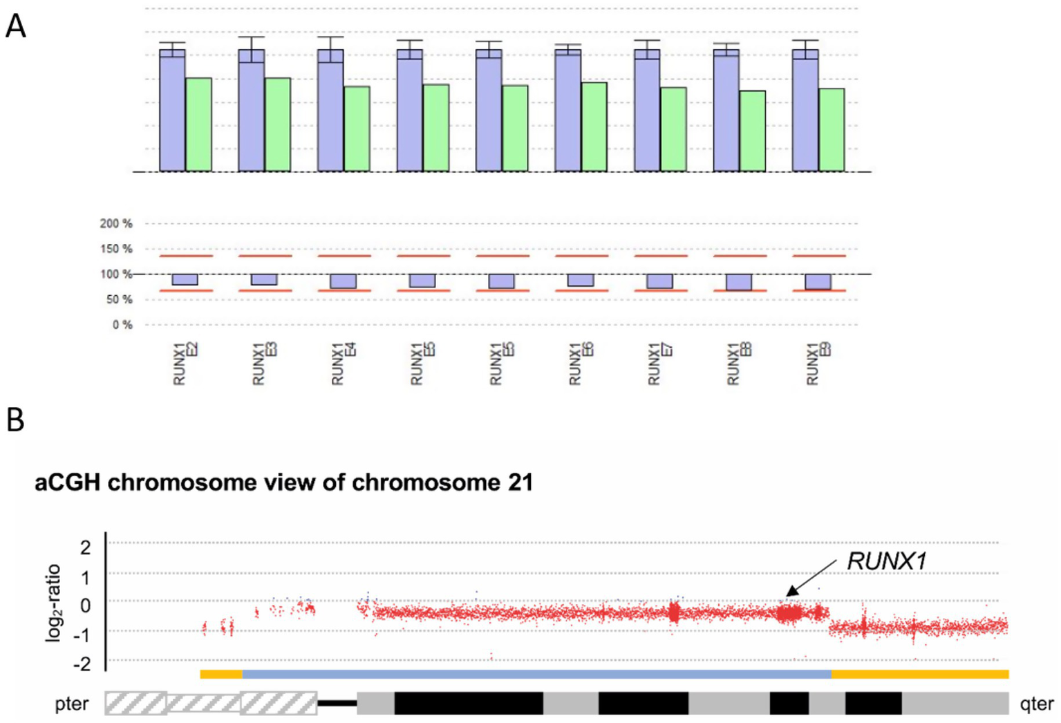 Pedigree and genetic analysis for family 1. (A) Genetic pedigree of family 1; black circle II.1 indicates the affected child (P1). (B) SeqPilot® CNV analysis: reduced copy number for the RUNX1 exons for the index patient (green columns) compared to the patients analyzed in the same enrichment (blue), indicating a heterozygous RUNX1-gene deletion. (C) Chromosomal microarray analysis: 1.56 Mb deletion (21q22.11q22.12 shown as a red bar) including RUNX1.
