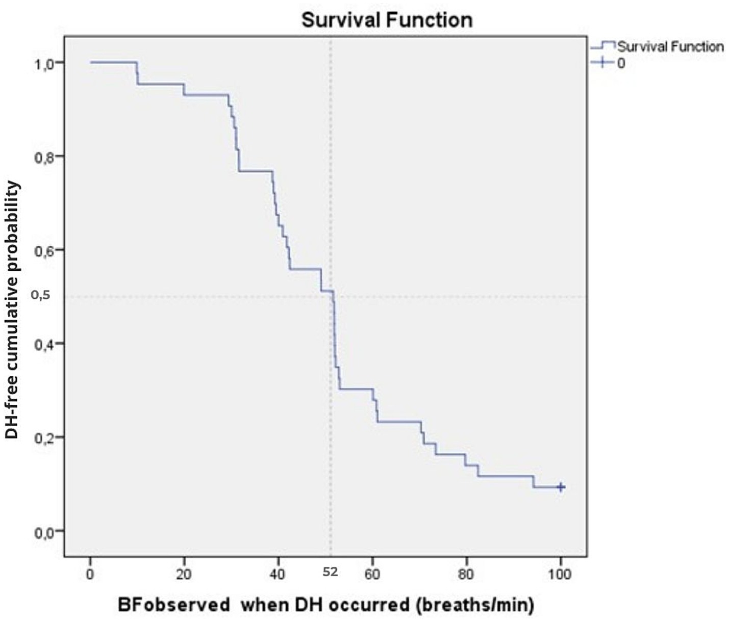Figure 1. Cumulative time-to-event plots of the DH event as a function of BF for the overall sample (n = 43). The Kaplan–Meier curve shows the cumulative probability of remaining DH-free according to BF at which DH occurred (BFDH). The vertical dotted line indicates the median threshold (52 breaths.min−1). Tick marks indicate censored observations (4 participants censored at BF = 100 breaths.min−1).