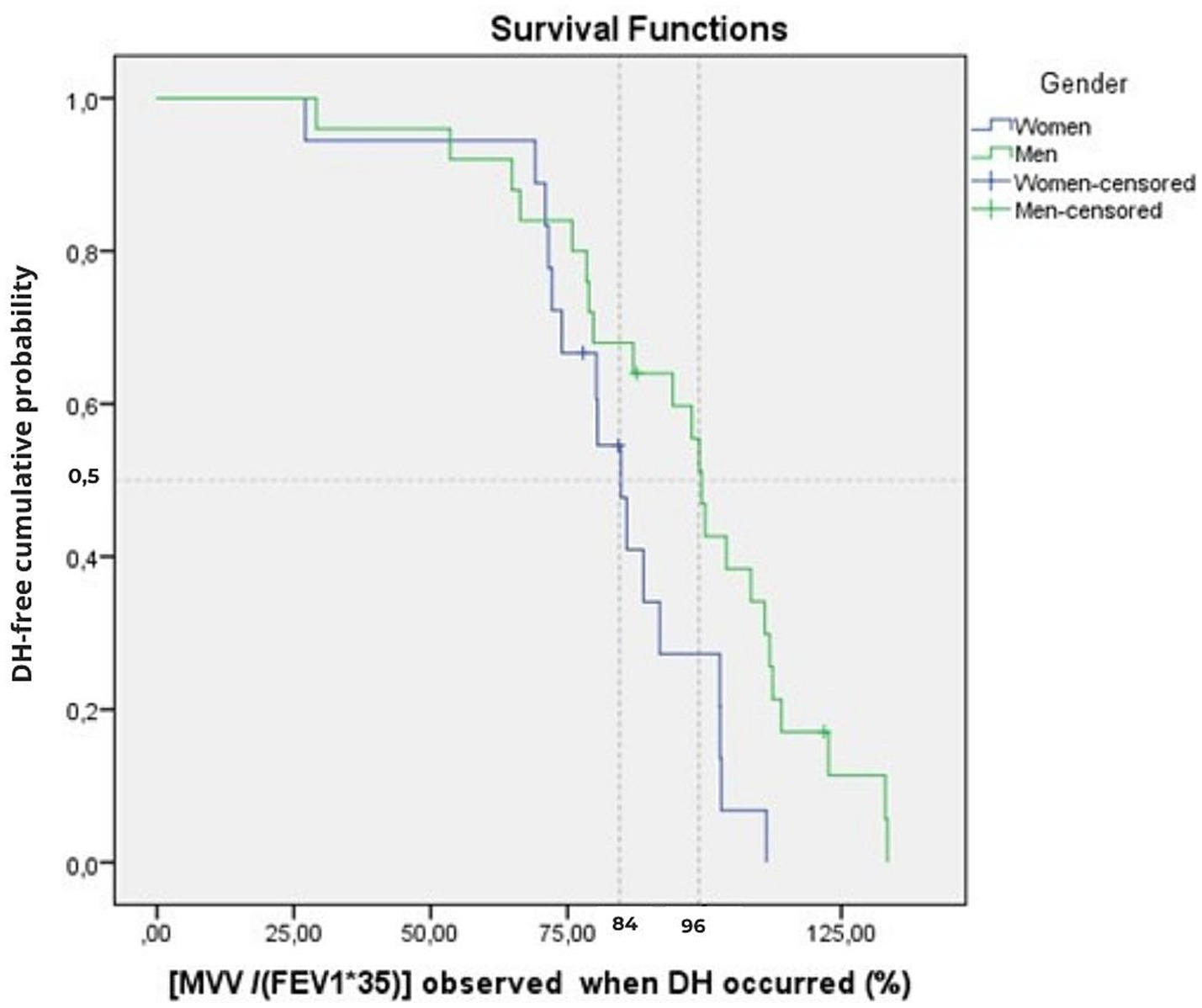 Figure 2. Cumulative time-to-event plots of the DH event as a function of ventilatory ratio [MVV/(FEV1*35)] for the women and men groups of the overall sample (n = 43). The Kaplan–Meier curve shows the cumulative probability of remaining DH-free according to the ventilatory ratio at which DH occurred. The vertical dotted line indicates the median threshold for women (84%) and men (96%). Tick marks indicate censored observations (four participants censored at BF = 100 breaths.min−1).