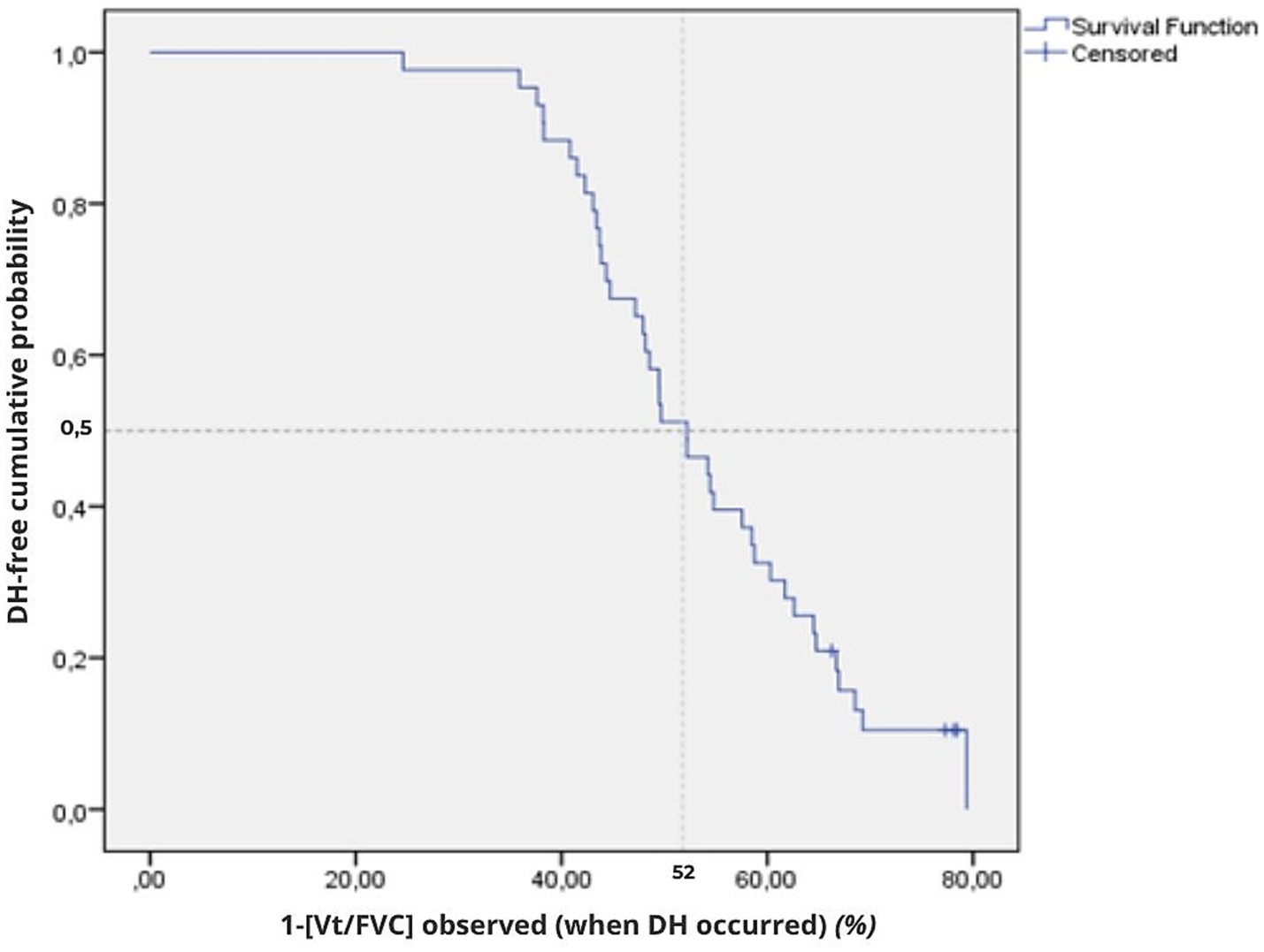 Figure 3. Cumulative time-to-event plots of the DH event using the complement of the volume ratio (1-[VT/FVC]) for the overall sample (n = 43). The Kaplan–Meier curve represents the cumulative probability of remaining DH-free according to [1–(VT/FVC)] at the onset of DH. The vertical dotted line indicates the median threshold (52%). Tick marks indicate censored observations (4 participants censored at BF = 100 breaths.min−1).