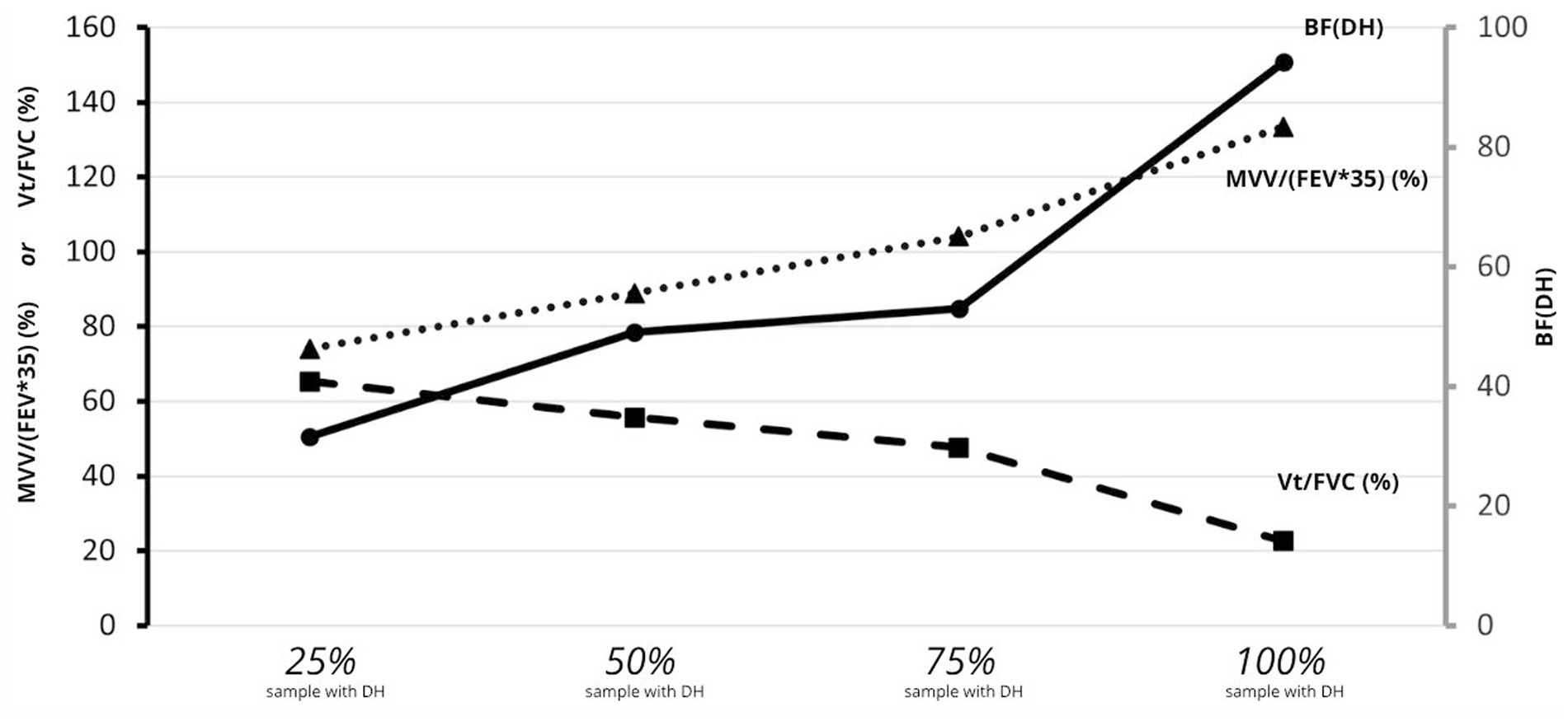 If a DH occurs, it would be of interest to acknowledge whether DH would depend on the BF at which the MVV is achieved and on two other parameters (all interdependent): the ventilatory ratio estimated by [VE/(FEV1*35)] and the volume ratio estimated by [Tidal Volume /Forced Vital Capacity: VT/FVC].