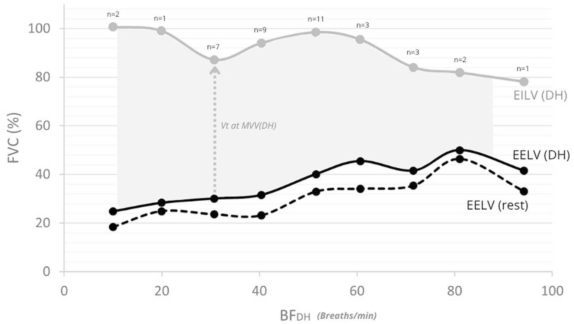 Figure 5. End-expiratory and end-inspiratory lung volumes (EELV/EILV) mean values at rest and at the onset of DH. Solid black line: mean EELV at DH onset; dashed black line: mean EELV at rest; grey line: mean EILV at DH onset. Numbers above the curve indicate the number of participants (n) contributing to each value at DH onset. The shaded area represents the mean VT developed during MVV at DH onset.