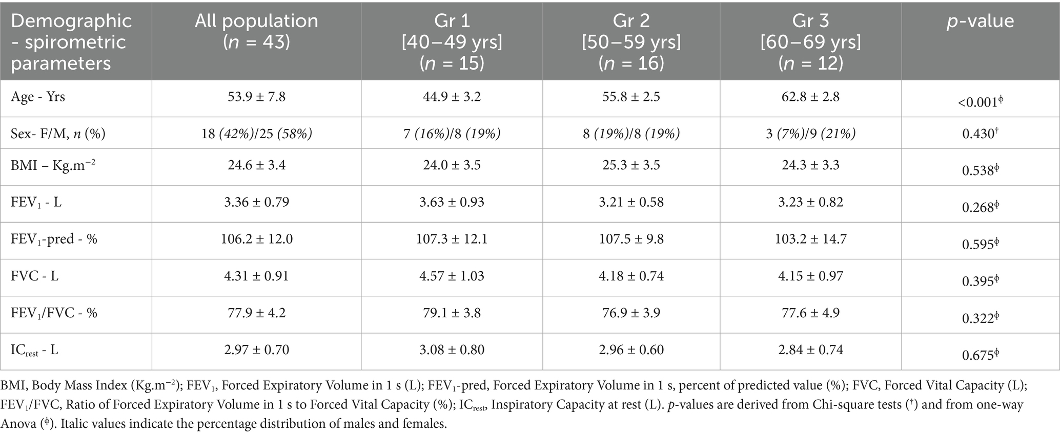 Between December 2013 and April 2014, 43 healthy subjects were included (18 women, 42%), aged 40–69 Yrs (mean 54 ± 8 Yrs, range 40–68 Yrs) with a mean BMI of 25 ± 3 Kg.m−2 (range 18–33 Kg.m−2), with spirometry parameters within the expected values. When we compared gender distribution, BMI, and all spirometric parameters, we did not observe any differences between the three age groups (all p ≥ 0.268) (Table 1).