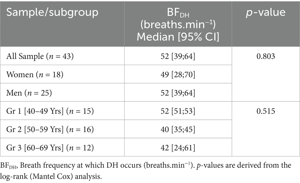 The earliest onset of DH was observed at a BF of 10/min in 2 subjects (5% of the sample), and 4 of the 43 participants were right-censored at BF = 100 breaths.min−1 (Figure 1). Time-to-event analysis revealed that, for the overall sample, DH was found in 50% of the sample at a BFDH of 52 breaths.min−1 [95%CI: 39–64 breaths.min−1]. After excluding the four subjects without DH, the mean BFDH for the 39 subjects with DH was 52 breaths.min−1 (Figure 1). The log-rank test showed no difference in median time-to-event BFDH between the three age groups (p = 0.515) (Table 2), nor with gender (p = 0.803).