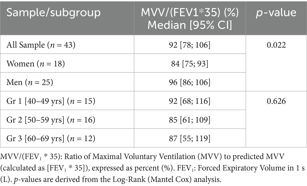 The log-rank test showed no difference in median ventilatory ratio [MVV/(FEV1*35)] of DH occurrence between the three age groups (p = 0.626) (Table 3), but we found a significant difference between genders, with a DH that appears at lower values in women (p = 0.022).