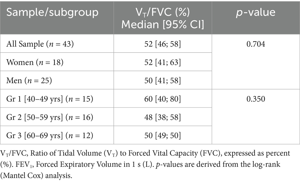 Table 4. Estimates of the median volume ratio [VT/FVC] of DH occurrence for the overall sample and by age groups (n = 43).