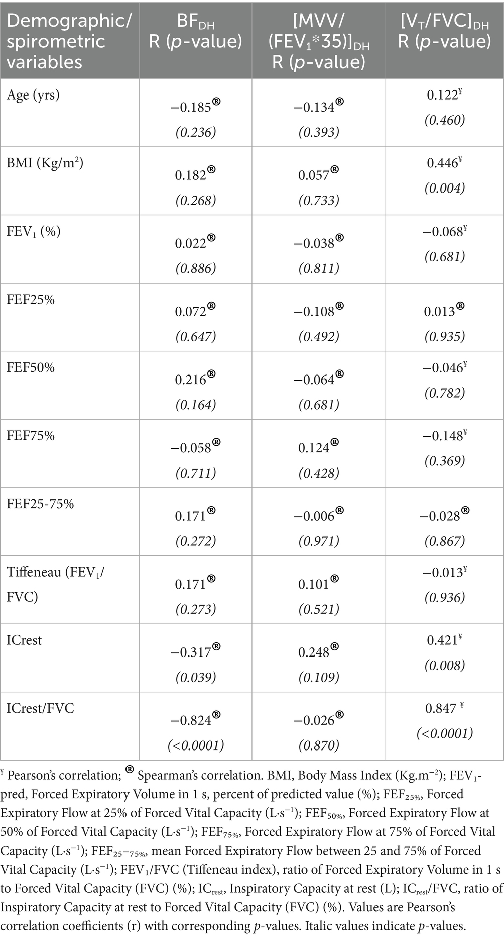 Table 5. Correlations between breath frequency of DH occurrence (BFDH), ventilatory ratio of DH occurrence [MVV/(FEV1*35)]DH, volume ratio of DH occurrence [VT/FVC]DH, and demographic/spirometric variables of the subjects.