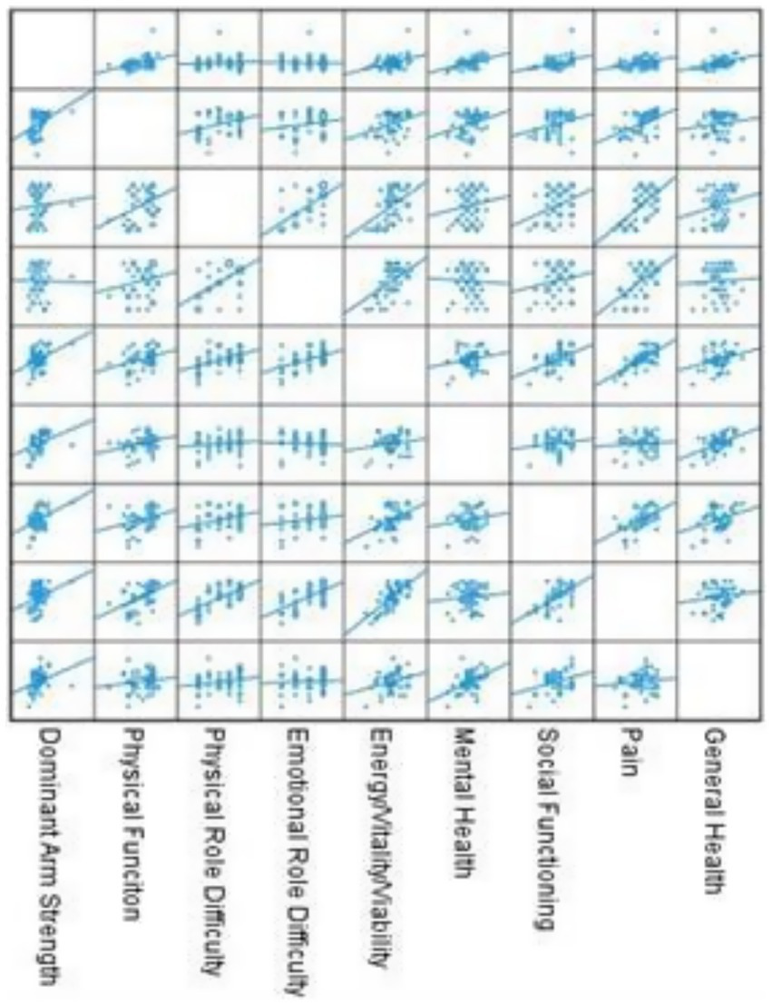 Figure 2 illustrates the correlation between the scores of the subscales of the SF-36 questionnaire and dominant arm hand grip strengthin the patient group.