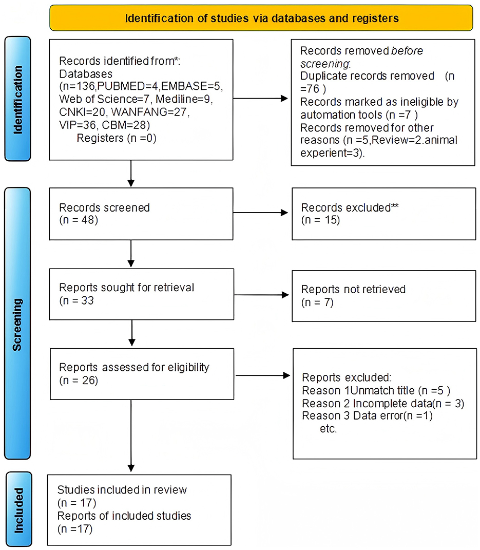 This study has been registered with PROSPERO (International Prospective Register of Systematic Reviews) with the study number CRD420251081616. This meta-analysis was conducted strictly in accordance with the PRISMA guidelines. A comprehensive search was performed in Pubmed, Mediline, Web of Science, Embase, Chinese Biomedical Literature Database (CBM), China National Knowledge Infrastructure (CNKI), Chinese Science Journal Database (VIP), and Wanfang Database up to June 26, 2025. The specific search strategies are shown in Supplementary material 1. There were no language restrictions. The retrieved literature was manually screened to identify potentially eligible studies.