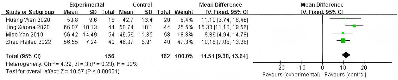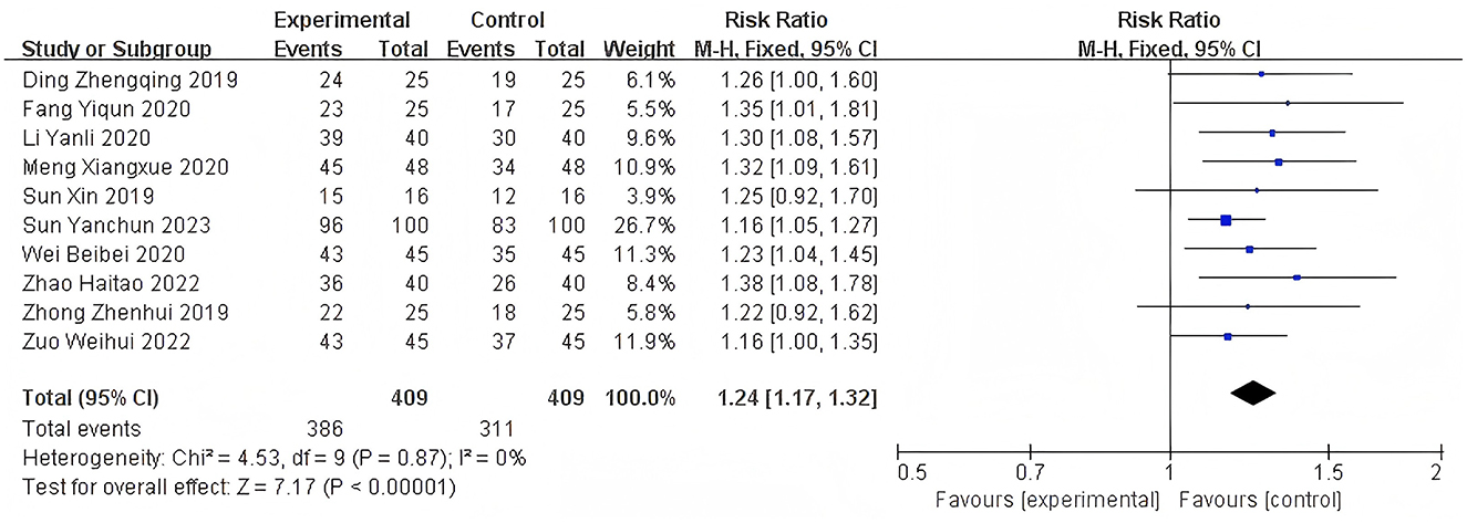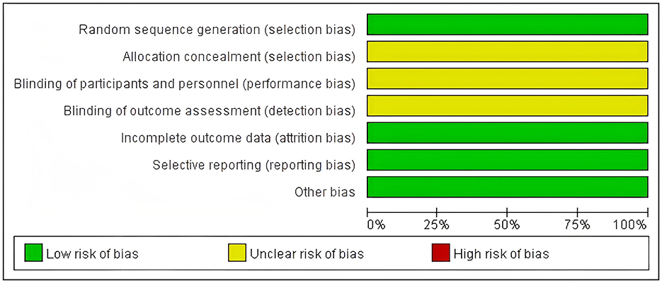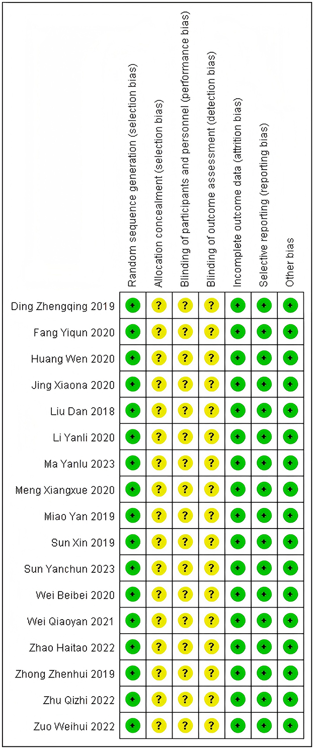 Assessed using the Cochrane RoB 2.0 tool. Random sequence generation: All 17 studies used a random number table method (low risk); Allocation concealment: Only 1 study explicitly described the method (low risk), while the rest did not mention it (unclear risk); Blinding of outcome assessors: None of the studies reported this (unclear risk); Completeness of outcome data: 12 studies had no dropouts/withdrawals (low risk); Selective reporting: 12 studies fully reported the pre-specified outcomes (low risk); Other biases: 12 studies did not explicitly state (low risk). As is shown in Figures 2, 3.