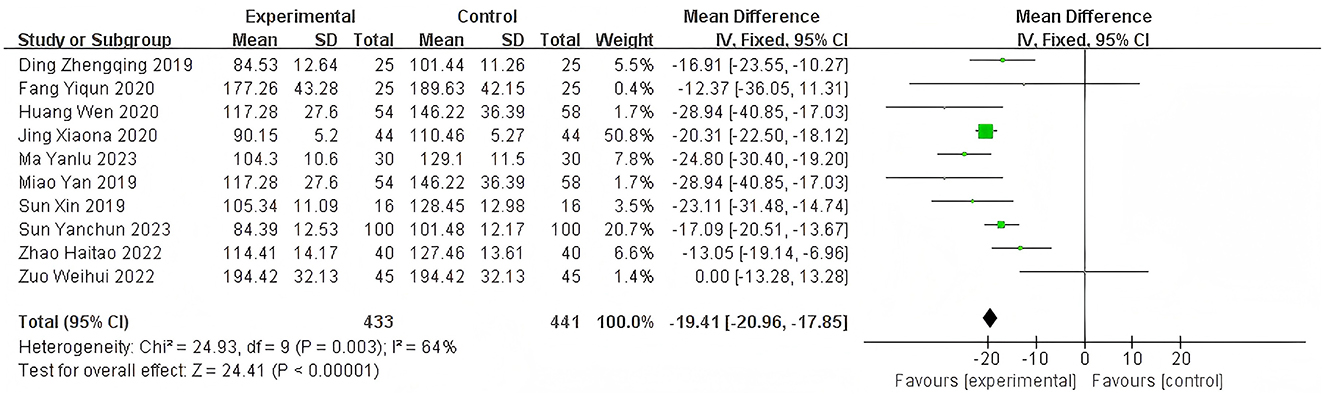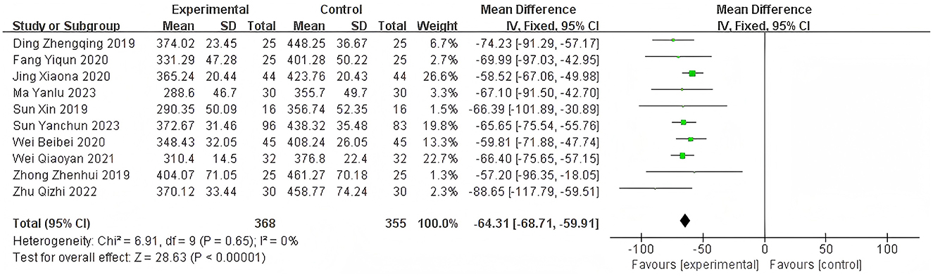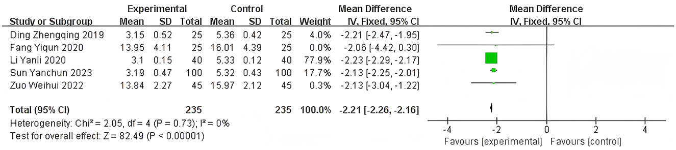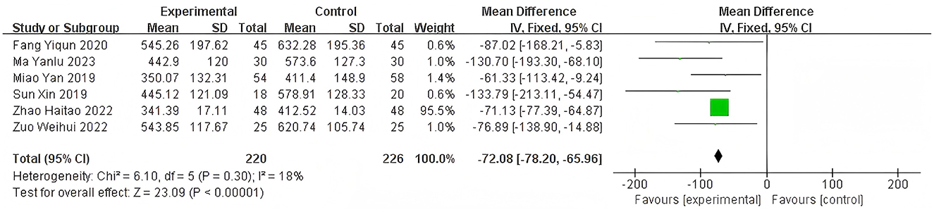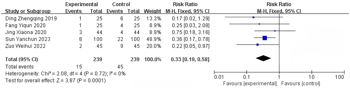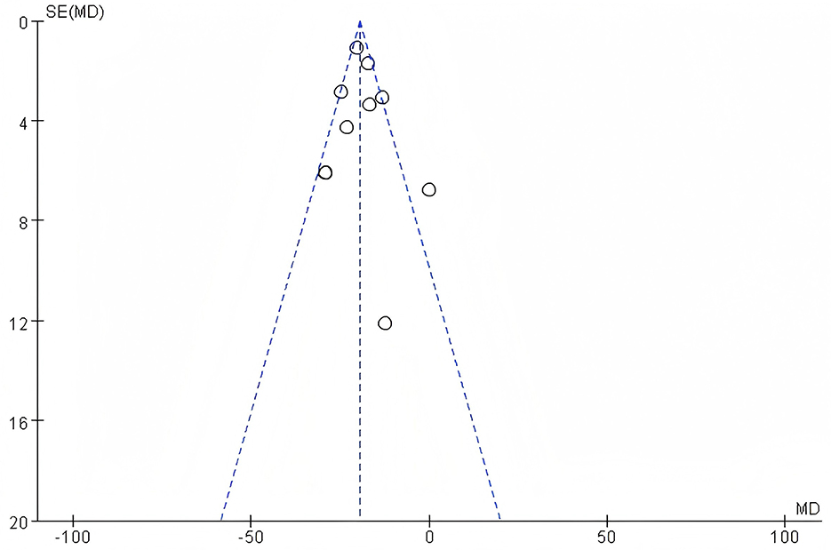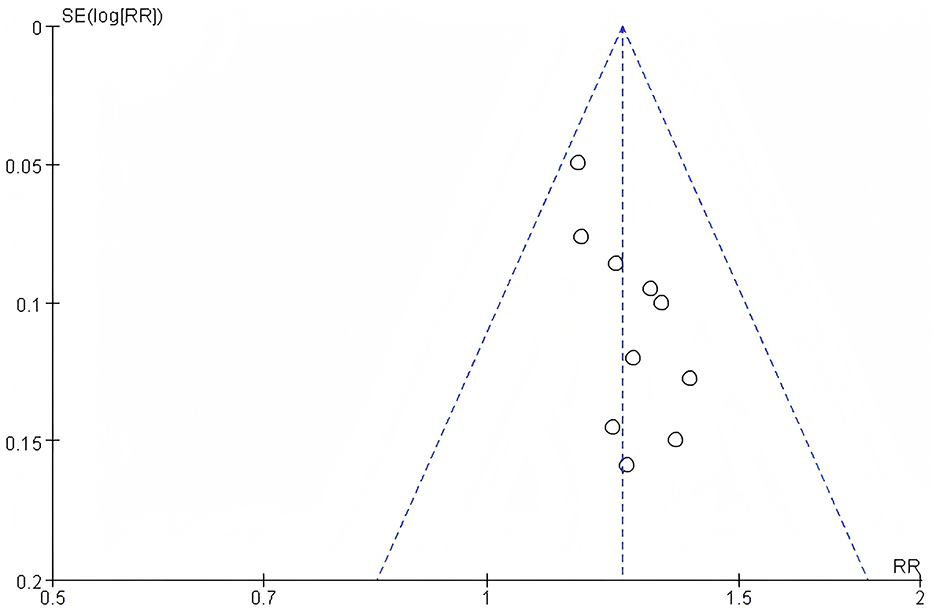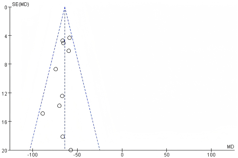 Heterogeneity of efficacy rate was tested among the ten selected studies. The test results showed that the I2statistic was 0%, and the P-value of the Q test was 1.00, which is significantly higher than the threshold of 0.1. This indicates that there was no significant statistical heterogeneity among the selected studies. Therefore, it was appropriate to use a fixed-effect model for analysis. The combined results of these ten studies showed a RR=1.24, with 95%CI [1.17, 1.32], which was statistically significant. The Z statistic was 7.17, with a P-value of 0.00001, < 0.05, indicating that febuxostat treatment for DKD+HUA was significantly more effective than the control group. For detailed information, please refer to the forest plot in the Appendix. For detailed information, please refer to the forest plot in the Appendix (Figure 4). Heterogeneity of adverse reactions was assessed among the five selected studies. The results indicated that the I2statistic was 0%, and the P-value of the Q test was 0.69. This suggests that there was no significant statistical heterogeneity among the included studies. Therefore, it was appropriate to use a fixed-effect model for analysis. The combined data from these five studies yielded a summary RR=0.33, with 95% CI[0.19,0.58], which was statistically significant. The specific manifestations of adverse reactions in the studies included rash, diarrhea, fever, renal function abnormalities, and liver function abnormalities. For detailed information, please refer to the accompanying forest plot. For detailed information, please refer to the forest plot in the Appendix (Figure 5). A comprehensive assessment of SUA was conducted across 12 articles. During the heterogeneity analysis, the I2value was as high as 80%, significantly exceeding the critical value of 50%, and the p-value of the Q test was < 0.01. This indicates that there was significant statistical heterogeneity among the included studies. Given this, it is particularly necessary to further explore the sources of heterogeneity. Through sensitivity analysis, we found that the studies Zuo et al. (15) and Wen et al. (11) contributed significantly to the heterogeneity. After excluding these two studies, the heterogeneity among the remaining 10 articles was significantly reduced, with an I2value of 0% and a p-value of 0.65, which exceeded the significance level of 0.1. Based on this result, this study decided to use a fixed-effect model for the meta-analysis. The combined effect size from these 10 studies was MD = −64.31, with a 95% CI [−68.71, −59.91], which was statistically significant (Z = 28.63, P < 0.00001). For detailed information, please refer to the forest plot in the Appendix (Figure 6). A comprehensive assessment of the UACR was conducted across seven studies. During the heterogeneity analysis, the I2statistic reached 83%, significantly exceeding the critical value of 50%, and the p-value of the Q test was < 0.01, indicating significant statistical heterogeneity among the included studies. Given this, it is necessary to further explore the sources of heterogeneity. Through sensitivity analysis, we found that the study published by Meng et al. (25) in 2020 contributed significantly to the heterogeneity. After excluding this study, the heterogeneity analysis of the remaining 6 studies showed that the I2value decreased to 18%, with a p-value of 0.30, which is higher than the significance level of 0.1. Based on this result, this study decided to use a fixed-effect model for the meta-analysis. The combined data from these 6 studies yielded a MD = −72.08, with a 95%CI [−78.20, −65.96], which was statistically significant. The Z value was 23.09, with P < 0.00001, indicating that febuxostat treatment for DKD+HUA was more effective in reducing UACR than the control group. For detailed information, please refer to the forest plot in the Appendix (Figure 7). A comprehensive assessment of Scr levels was conducted across 10 articles. During the heterogeneity analysis, the I2statistic was 64%, indicating moderate heterogeneity among the studies. Therefore, a random-effects model was chosen for the meta-analysis. The combined data from these 10 studies yielded a MD = −19.24, with a 95%CI [−20.87, −17.61], which was statistically significant (Z = 23.07, P < 0.00001). This indicates that febuxostat treatment for DKD+HUA is more effective in reducing Scr levels compared to the control group. For detailed information, please refer to the forest plot in the Appendix (Figure 8). An assessment of the eGFR data was conducted across the four included studies. During the heterogeneity analysis, the I2statistic was 30%, indicating low heterogeneity among the studies. Therefore, a fixed-effect model was chosen for the meta-analysis. The combined data from these 4 studies yielded a MD = 11.51, with a 95% CI [9.38, 13.64], which was statistically significant. The Z value was 10.57, with a P < 0.00001, indicating that febuxostat treatment for DKD+HUA is significantly more effective in improving eGFR compared to the control group. For detailed information, please refer to the forest plot in the Appendix (Figure 9). A comprehensive assessment of BUN levels was conducted across five relevant articles. During the heterogeneity analysis, the I2statistic was 0%, indicating homogeneity among the included studies. Therefore, a fixed-effect model was chosen for the meta-analysis. The combined data from these five studies yielded a MD = −2.21, with a 95% CI [−2.26, −2.16], which was statistically significant. The Z value was 82.49, with a P < 0.00001, indicating that febuxostat treatment for DKD+HUA is significantly more effective in reducing BUN levels compared to the control group. For detailed information, please refer to the forest plot in the Appendix (Figure 10).