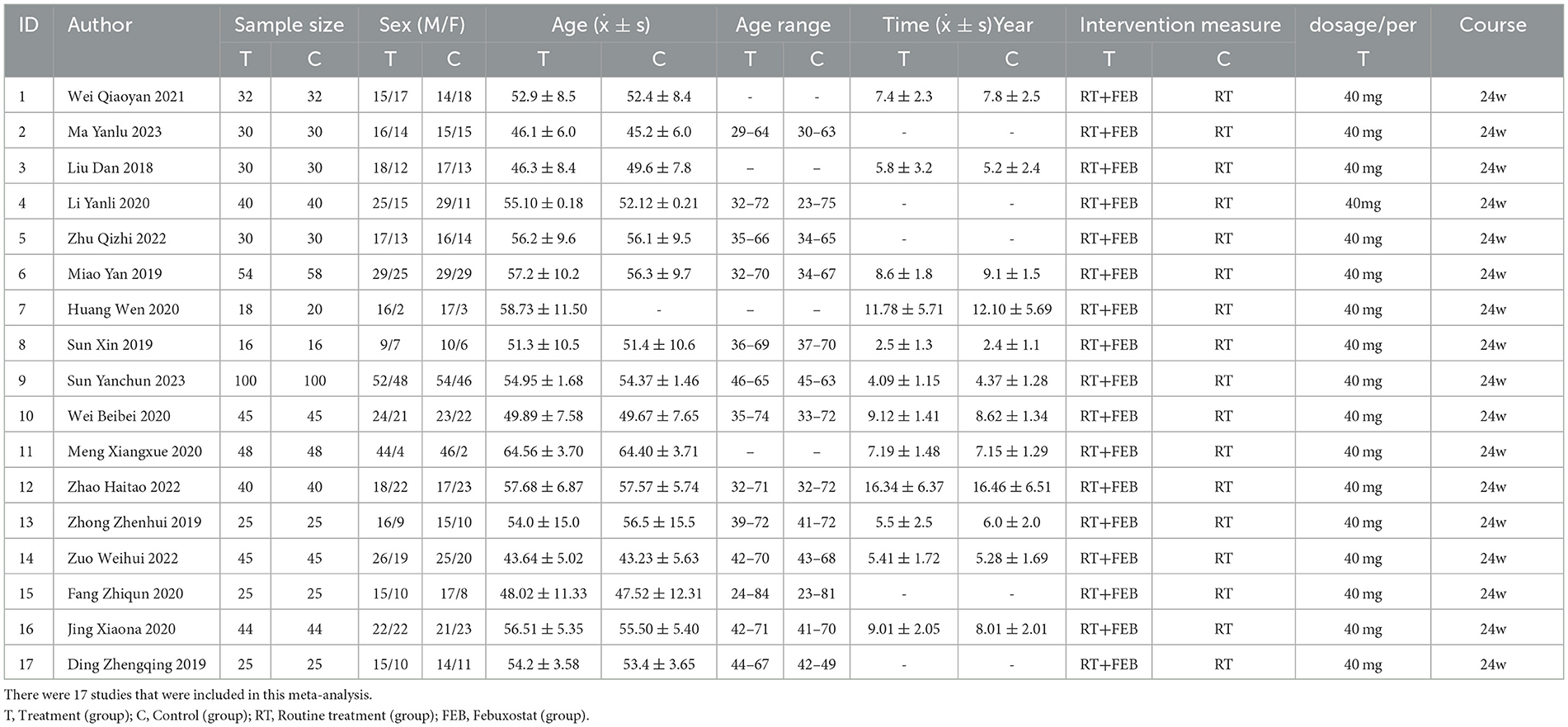 A total of 17 RCTs (11–26) were finally included (total sample size n = 1,300; 647 in the treatment group and 653 in the control group). All studies used febuxostat as the intervention drug. The literature search process is shown in Figure 1, and the basic information of the included studies is presented in Table 1.