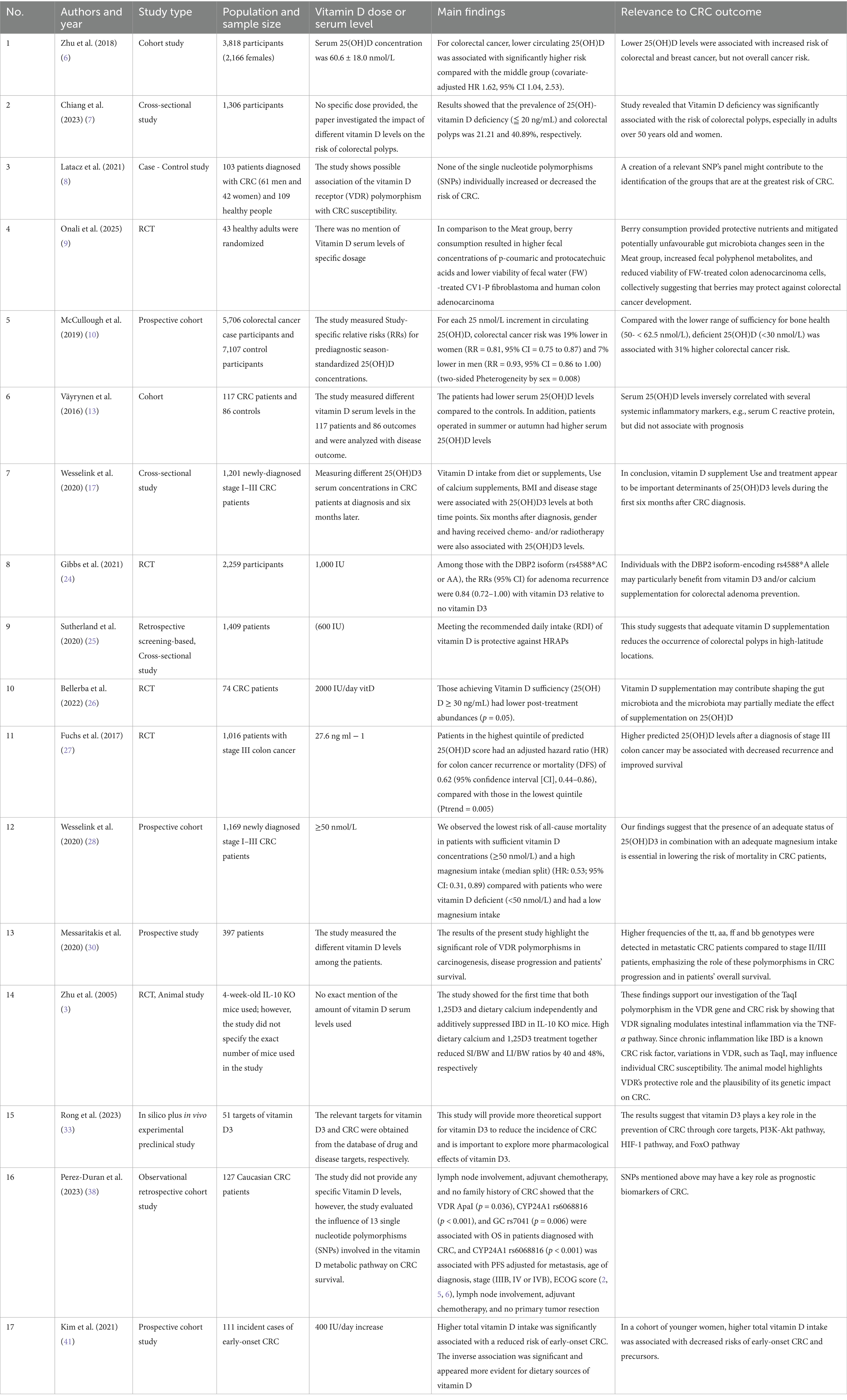 We predominantly excluded non-peer-reviewed articles, non-English publications, animal studies, and studies lacking relevance to the clinical aspects of vitamin D in CRC. Based on thematic relevance rather than formal screening, a total of 41 studies were included: 18 primary studies and 23 systematic reviews/meta-analyses. See Table 1 for a systematic summary of the primary studies in our review.