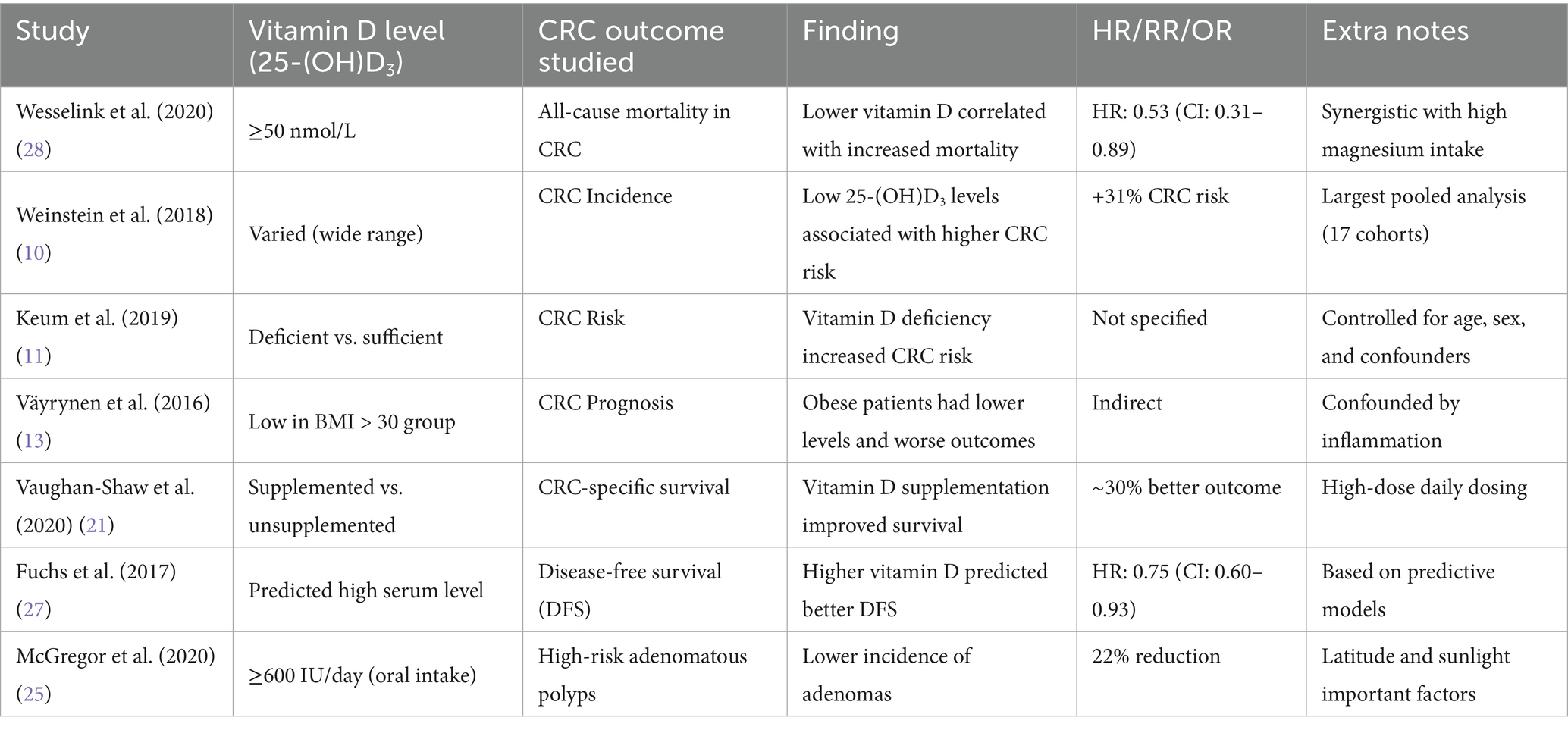Conversely, a meta-analysis by Keum et al. (2014) reported no statistically significant association between vitamin D supplementation and overall cancer incidence. Supporting this, a 2022 meta-analysis of RCTs by Emmanouilidou G. et al. found that vitamin D supplementation did not appear to play a chemopreventive role in colorectal neoplasms. Nonetheless, both reviews acknowledged the limitations in existing studies—particularly the use of low vitamin D doses (≤1,100 IU/day) and small sample sizes—highlighting the need for further investigation in this area (19). Interestingly, while these studies failed to establish a role for vitamin D in reducing cancer incidence, some observed modest but notable reductions in cancer-related mortality (see Table 2 for summarized findings from major studies). For instance, more recent data suggest that daily vitamin D supplementation may reduce cancer mortality by approximately 13%, with a relative risk (RR) of 0.87 (95% CI: 0.78–0.96), although this effect did not vary significantly across different subgroups (20). Moreover, the initial Keum meta-analysis also reported a 7% reduction in overall mortality, of which one-third of deaths were attributed to cancer. While these findings are not definitive, they suggest a potential survival benefit, particularly when consistent, higher-dose regimens are utilized—underscoring the necessity for larger, well-designed trials to clarify vitamin D’s therapeutic role in CRC prevention and prognosis (20).