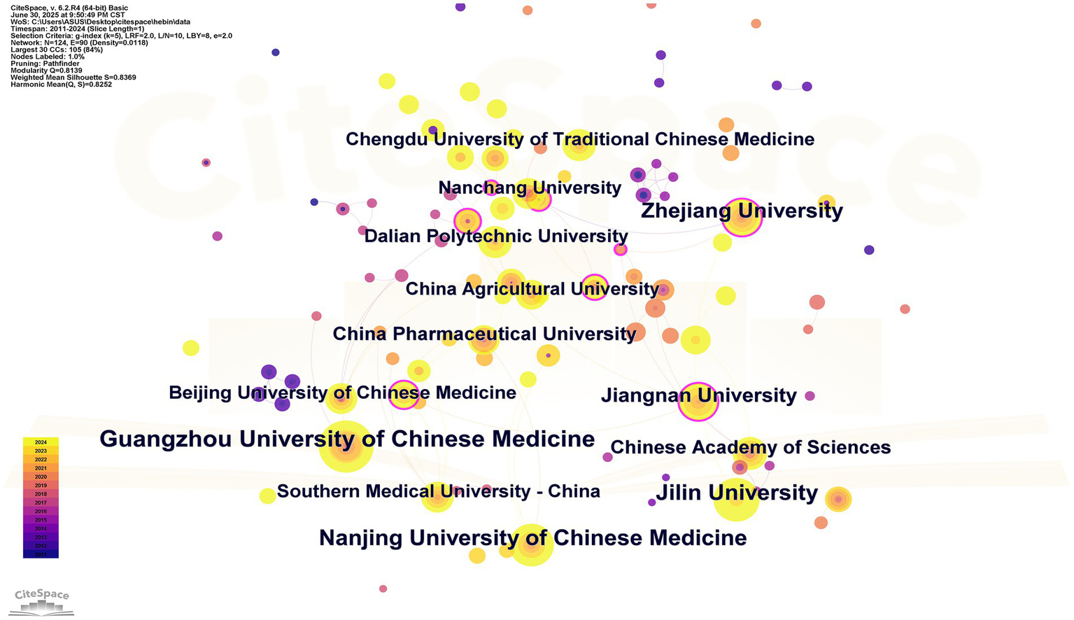 Institutional cooperation network. Each node represents a distinct research institution, with the size of the node positively correlated to its publication output—the larger the node, the more prolific the institution’s academic contributions. The arcs connecting the nodes signify collaborative relationships between institutions, where the thickness of the arcs reflects the intensity of collaboration; thicker arcs indicate higher frequencies of cooperation. Isolated nodes (those without connections) represent institutions that have not established collaborative ties with others. Nodes with purple edges denote institutions with high centrality within the network, signifying their pivotal role in the collaborative framework.