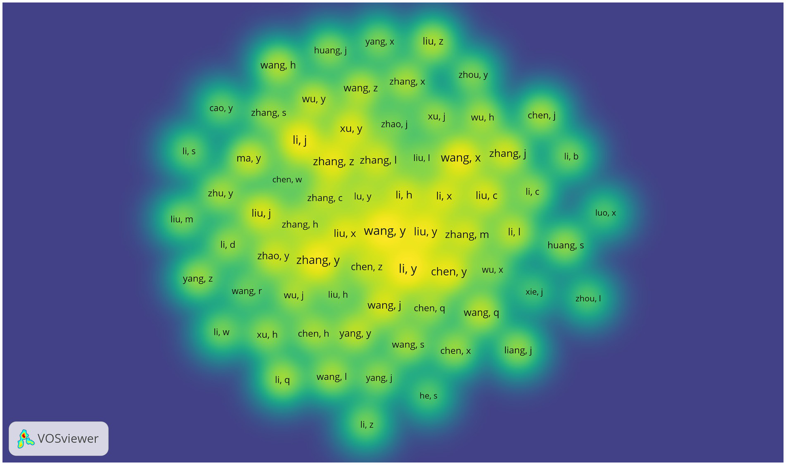 Density map of authors. The color gradient transitions from deep blue to bright yellow, symbolizing the gradient change in author density. Deep blue areas represent regions with lower author density, where the frequency of collaboration among authors is relatively low. Conversely, yellow areas indicate higher author density, reflecting a higher frequency of collaboration among these authors.