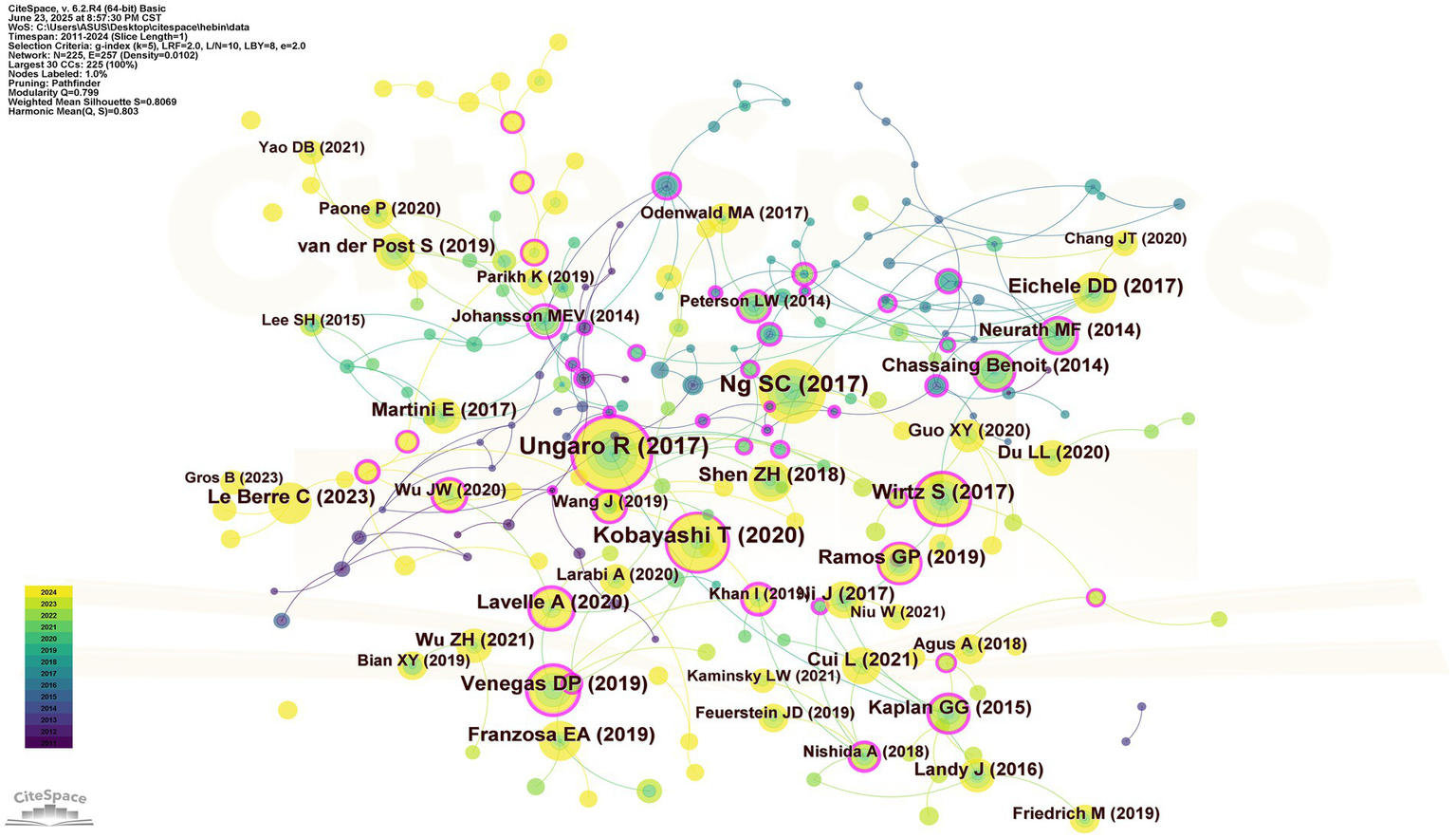 Author analysis plays a pivotal role in pinpointing leading scholars within a specific research domain. In Table 3, the ten most prolific authors in the area of intestinal barrier and UC research are presented, along with their primary co-cited authors, thereby underscoring their scholarly output and impact. Wei Chen from Sir Run Run Shaw Hospital, affiliated with Zhejiang University School of Medicine, occupies the foremost position with 14 publications and an impressive citation count of 290. Noteworthy is Professor Yitao Wang from the University of Macau, who has produced a comparable volume of publications (n = 9) to other prolific authors, yet boasts a remarkable citation tally of 327, indicating his considerable scholarly influence in this arena. Among the co-cited authors, the most frequently cited is Professor Siew C Ng from the University of Hong Kong, with 190 citations, closely followed by Professor Malin E V Johansson from Huazhong University of Science and Technology, who has received 187 citations.