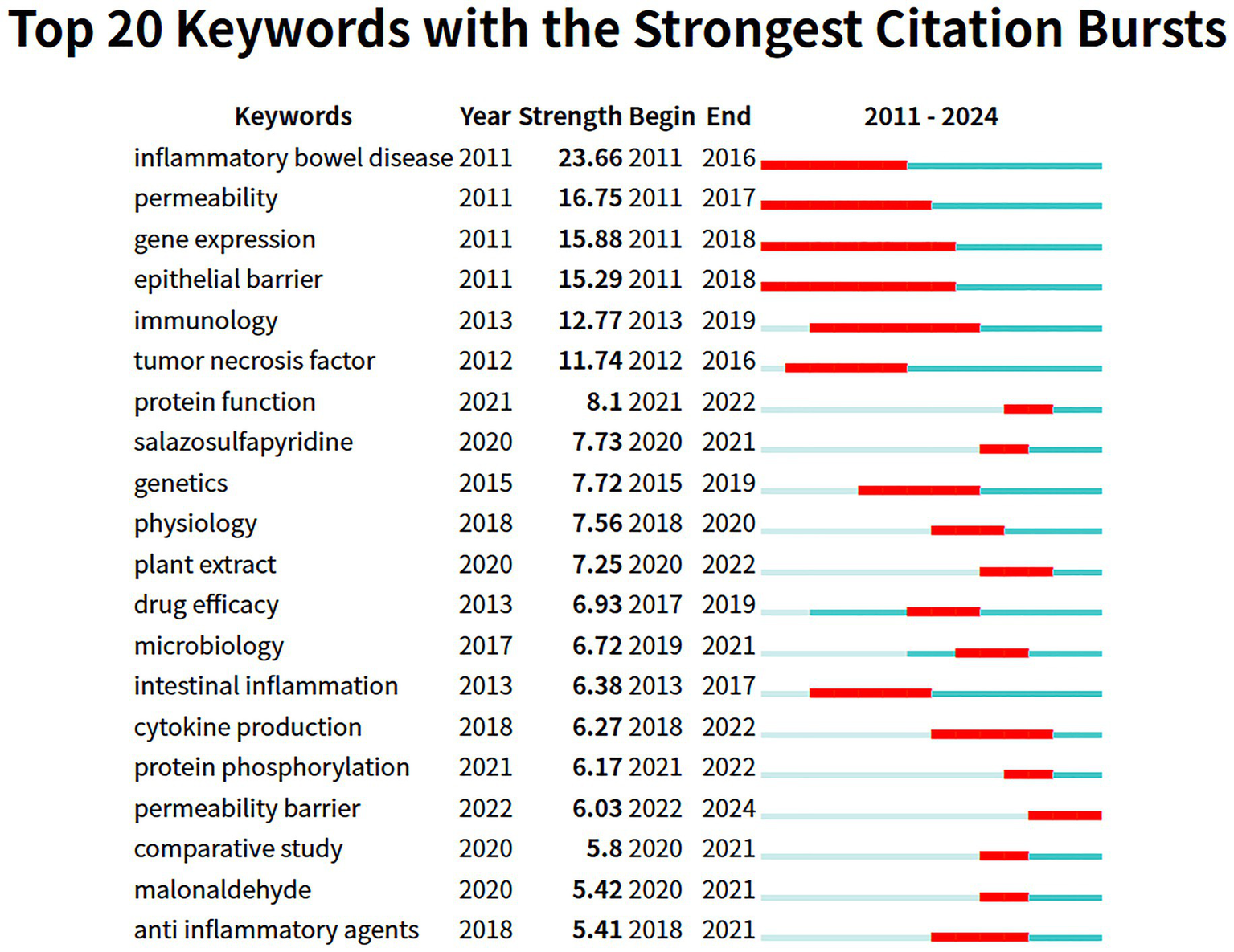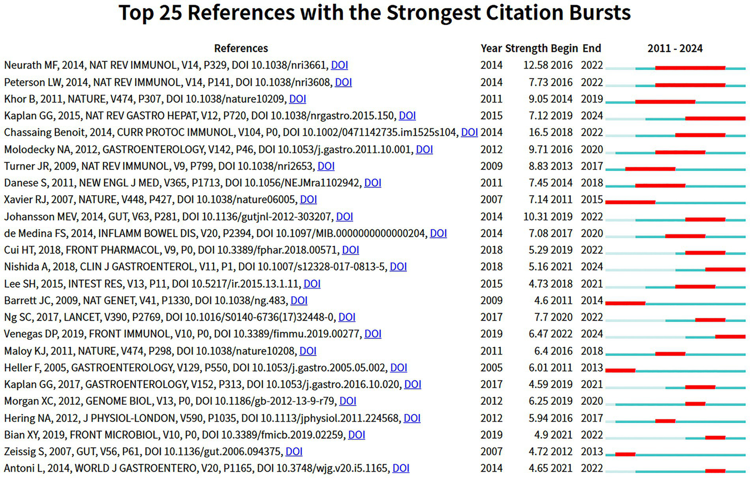 A total of 240 co-cited references were identified in this study. Literature retrieval was conducted through the WoSCC, and the data were refined by excluding author self-citations. Ultimately, the top 10 most frequently cited core references were selected and presented in Table 5. The article titled “Worldwide incidence and prevalence of inflammatory bowel disease in the 21st century: a systematic review of population-based studies” authored by Ng, Siew C is notable for its 3,868 citations, underscoring its significant influence within the discipline. The impact factors and Journal Citation Reports (JCR) quartile classifications for all references were ascertained using the Chinese Academy of Sciences Journal Partition Table (2025 edition). Figure 6 illustrates a visualization network of co-cited references, where the work by Johansson, Mev attained the highest centrality score of 0.76, indicating its essential role in the intellectual framework of this research area. Furthermore, a publication exhibiting significant citation bursts typically indicates its landmark status in related inquiries, reflecting a strong acknowledgment from the academic community regarding its contributions. For example, the article “Cytokines in inflammatory bowel disease” by Markus F Neurath ranks at the forefront with a citation burst strength of 12.58, emphasizing its remarkable prominence in the year 2014. Concurrently, the research conducted by Gilaad G Kaplan entitled “The global burden of IBD: from 2015 to 2024” demonstrates a sustained citation burst, indicating its lasting and significant impact on subsequent research endeavors (Figures 7, 8).