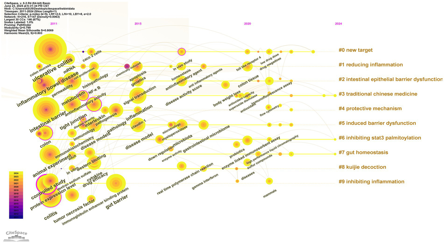 To improve the interpretability of bibliometric data, we integrated these indicators with expertise, which enables a systematic investigation of transitions in intestinal barrier research related to UC. Co-citation analysis is employed to identify influential knowledge bases and foundational topics, while keyword co-occurrence and burst detection reveal emerging research hotspots and shifts in scientific attention. This transition has evolved from early mechanistic inquiries into tight junction integrity and inflammatory signaling to recent emphases on gut microbiota modulation, organoid modeling, and translational interventions.