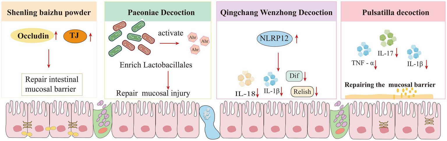 Ulcerative colitis (UC) is a long-lasting and advancing inflammatory bowel disorder marked by ongoing inflammation and ulcerative lesions, primarily targeting the colon and rectum. Clinically, individuals diagnosed with UC commonly exhibit symptoms such as diarrhea, abdominal discomfort, weight reduction, and anemia. As the condition advances, these manifestations generally intensify over time. Although the complete pathogenesis of UC remains unclear, it is significantly linked to genetic predisposition, dysregulation of the immune response, and alterations in gut microbiota composition (1, 2). Studies have demonstrated that a compromised intestinal barrier function is fundamental to the onset of UC. In particular, the disruption of tight junctions (TJs) leads to increased intestinal permeability, which can instigate uncontrolled inflammatory reactions (3, 4). Consequently, preserving the integrity of the intestinal barrier is essential for both the prevention and management of UC. Recently, efforts to restore the intestinal barrier have emerged as a central theme in the development of anti-colitis therapies (5, 6). Currently, Western medicines used for the treatment of UC, such as 5-aminosalicylic acid (5-ASA), not only demonstrate good clinical efficacy but also exhibit protective effects on intestinal barrier function. Studies have shown that 5-ASA treatment alleviates dextran sulfate sodium (DSS)-induced colitis in mice and significantly increases the protein expression levels of junctional adhesion molecule-A (JAM-A) and Occludin. Furthermore, 5-ASA promotes the proliferation of colonic epithelial cells, thereby enhancing intestinal barrier function (7). An oral 5-ASA delivery system has demonstrated significant alleviating effects in a DSS-induced colitis model, upregulating the expression of claudin-1, Occludin, and zonula occludens-1 (ZO-1) in NCM460 cells and enhancing intestinal epithelial barrier integrity (8).