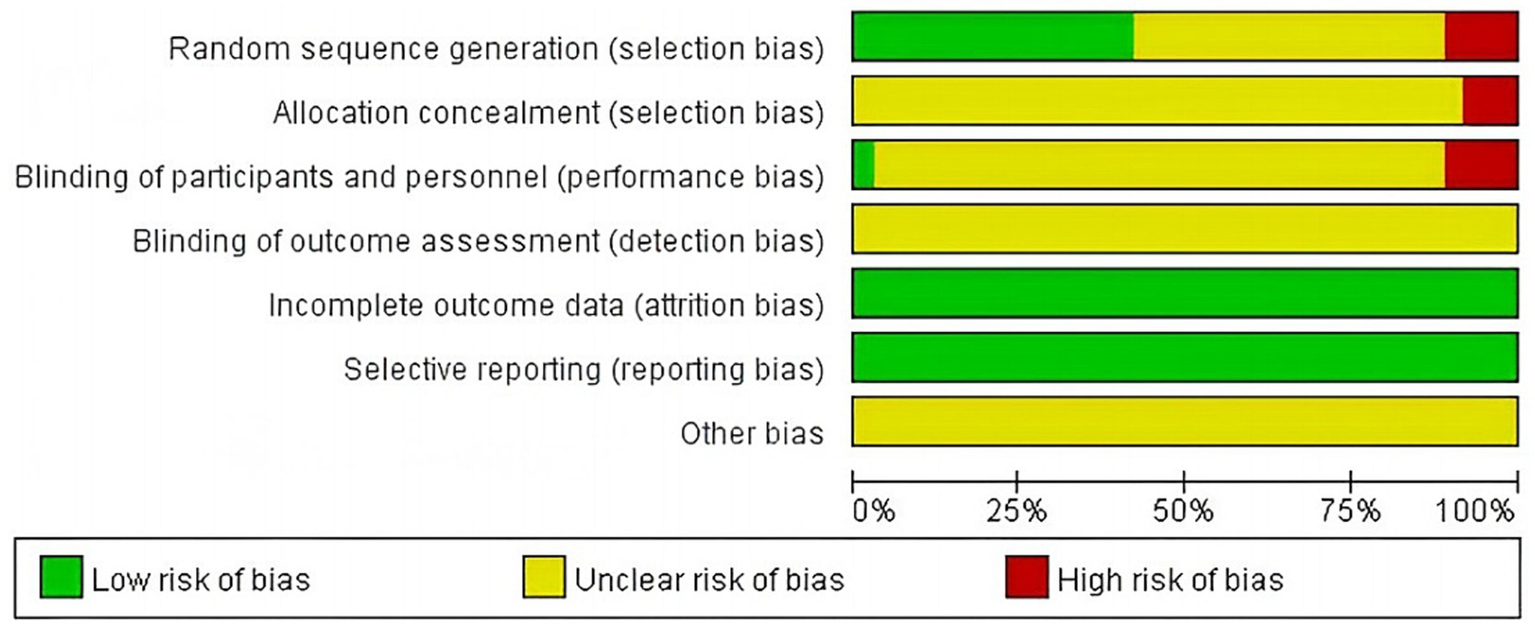 The methodological quality of the included literature was assessed using the Risk of Bias Assessment Tool provided by the Cochrane Collaboration Network (18), and the quality profile of each RCT was independently assessed in the following seven aspects. (1) Application of randomization methods; (2) implementation of allocation concealment schemes; (3) implementation of blinding of study populations, and treatment regimen implementers; (4) implementation of blinding of outcome measures; (5) completeness of outcome data; (6) selective reporting of study results; and (7) other sources of bias (e.g., sample size estimation, baseline comparability, etc.). In the context of research, each entry’s risk is classified as “low risk” when specified conditions are fulfilled, as “high risk” when these conditions are not met, and as “uncertain” when there is insufficient information to make a definitive assessment. The final assessment of the risk of bias in the literature was conducted using established criteria, resulting in three qualitative outcomes: “high,” “low,” and “uncertain.”