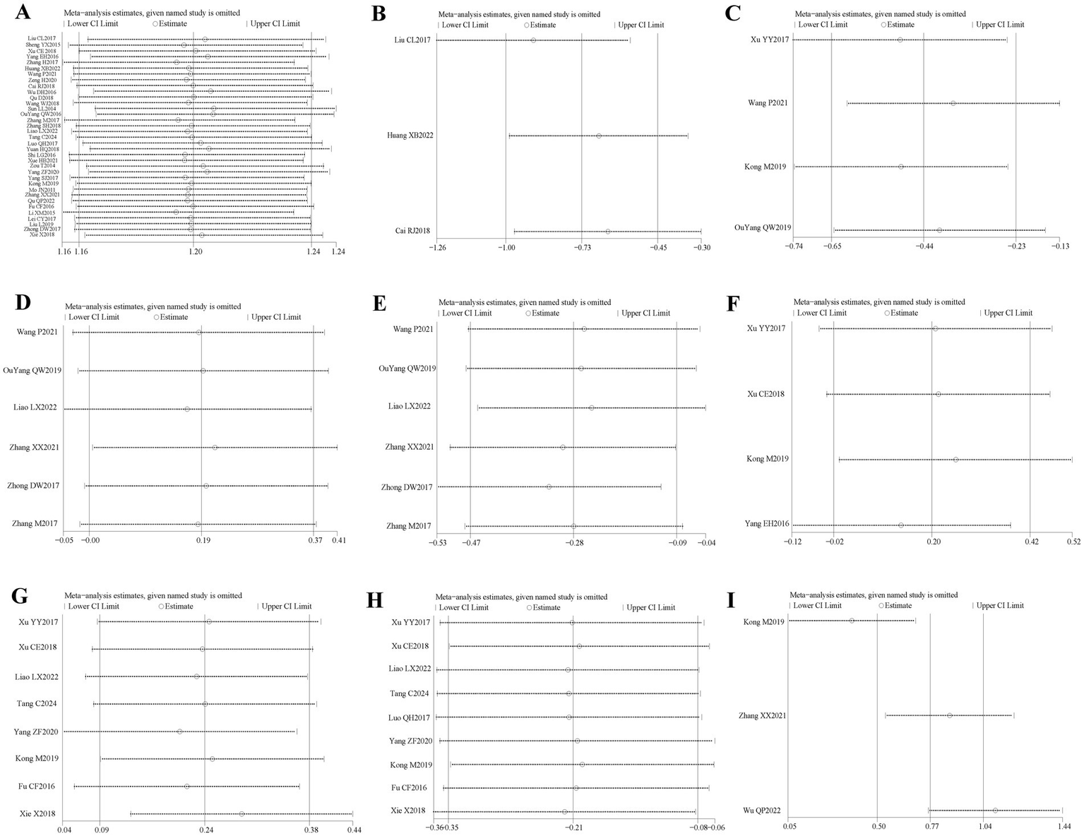 Figure 4. Sensitivity analysis diagram for each outcome indicator. Panel (A) is the total efficiency sensitivity analysis graph; (B) is the SFGS static score sensitivity analysis graph; (C) is the H-B Facial Nerve Function Grading score sensitivity analysis graph; (D) is the FDIP score sensitivity analysis graph; (E) is the FDIS score sensitivity analysis graph; (F) is the Facial Nerve Conduction Velocity sensitivity analysis graph; (G) is the CMAP amplitude sensitivity analysis graph; (H) is the R1 latency sensitivity analysis graph; (I) is the Portmann score sensitivity analysis plot.