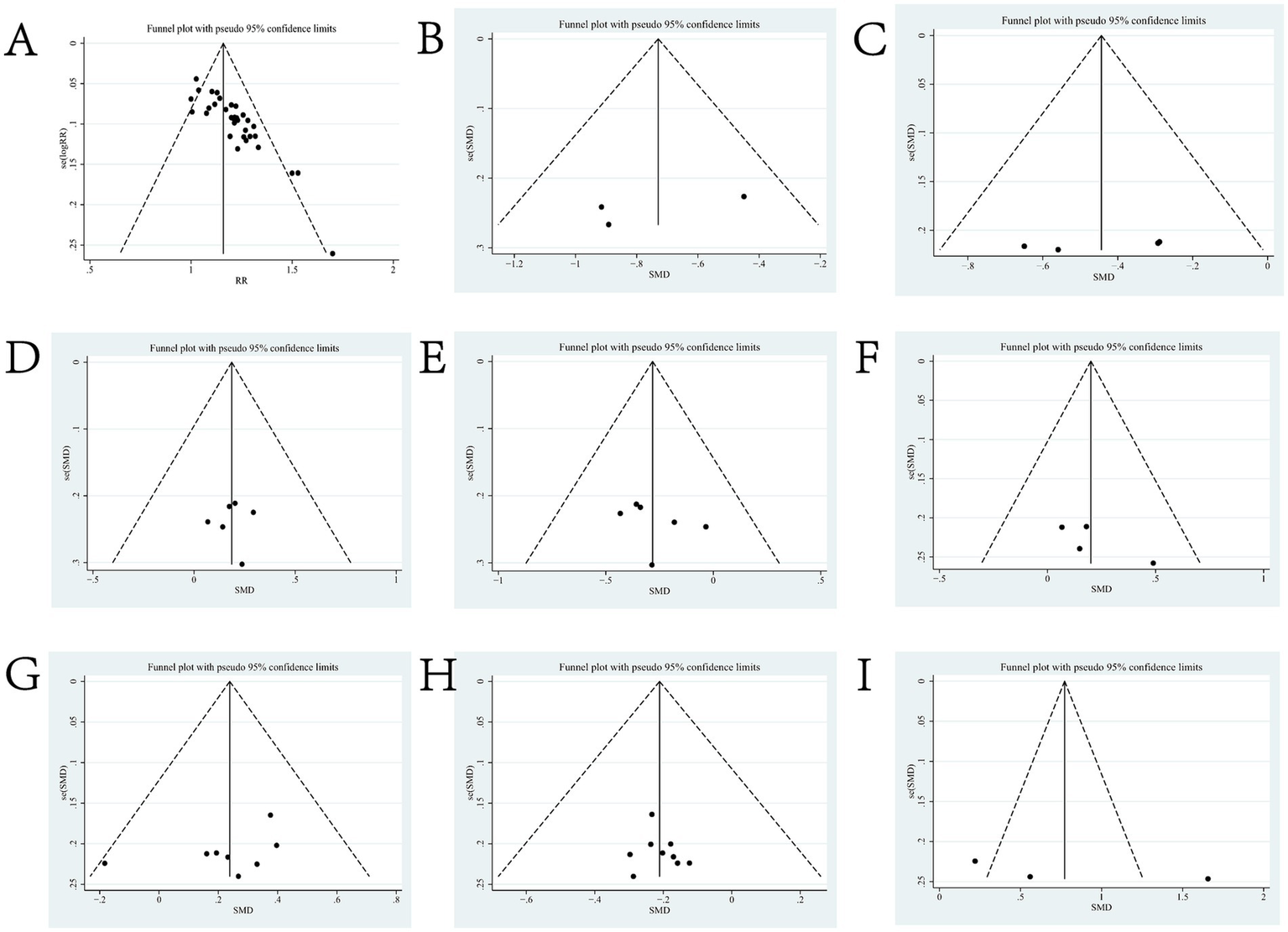 Figure 6. Funnel charts for outcome indicators. Panel (A) is the funnel plot of total efficiency; (B) is the funnel plot of SFGS static score; (C) is the funnel plot of H-B Facial Nerve Function Grading score; (D) is the funnel plot of FDIP score; (E) is the funnel plot of FDIS score; (F) is the funnel plot of Facial Nerve Conduction Velocity; (G) is the funnel plot of CMAP amplitude; (H) is the funnel plot of R1 Latency; and (I) is the Forest Plot of Portmann Score.