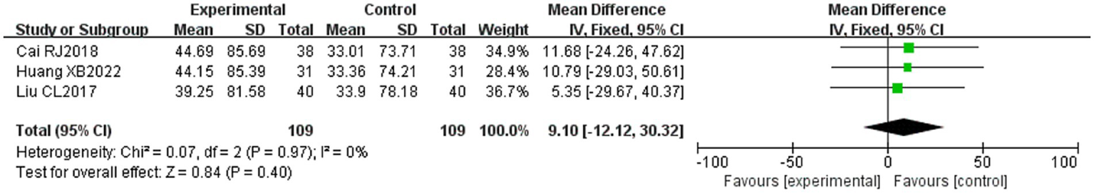 Three of the 36 included literature (22, 42, 45) reported changes in SFGS dynamic scores before and after treatment of study participants, and a total of 218 patients were included. Heterogeneity test: (I2 = 0%, p = 0.97), there was no statistical heterogeneity in the literature, and a fixed effect model was used (Figure 8). The meta-analysis demonstrated no statistically significant difference in SFGS dynamic scores changes between the two groups (MD = 9.10, 95% CI [−12.12, 30.22], p = 0.40), indicating comparable efficacy in improving SFGS dynamic scores between the two treatment regimens.