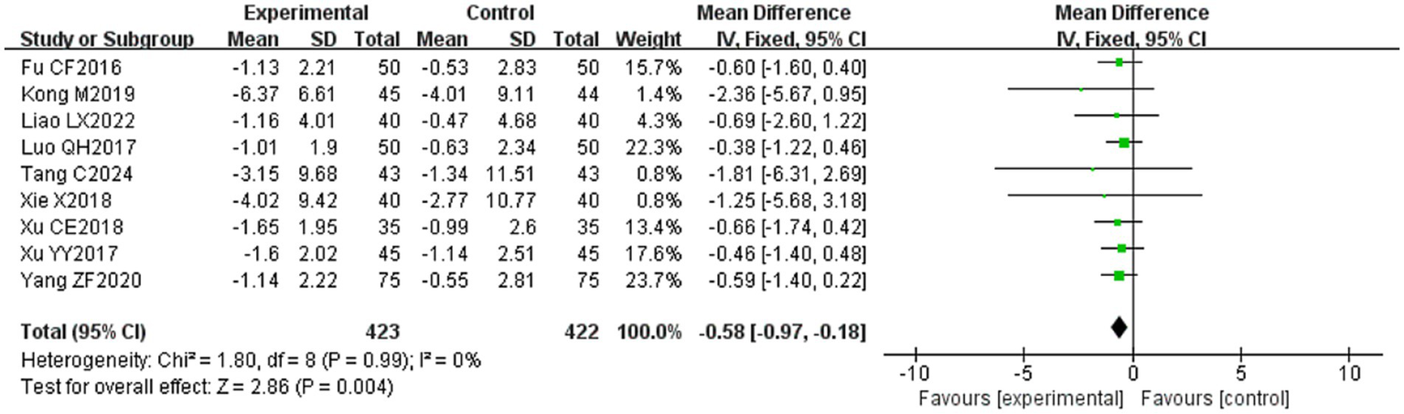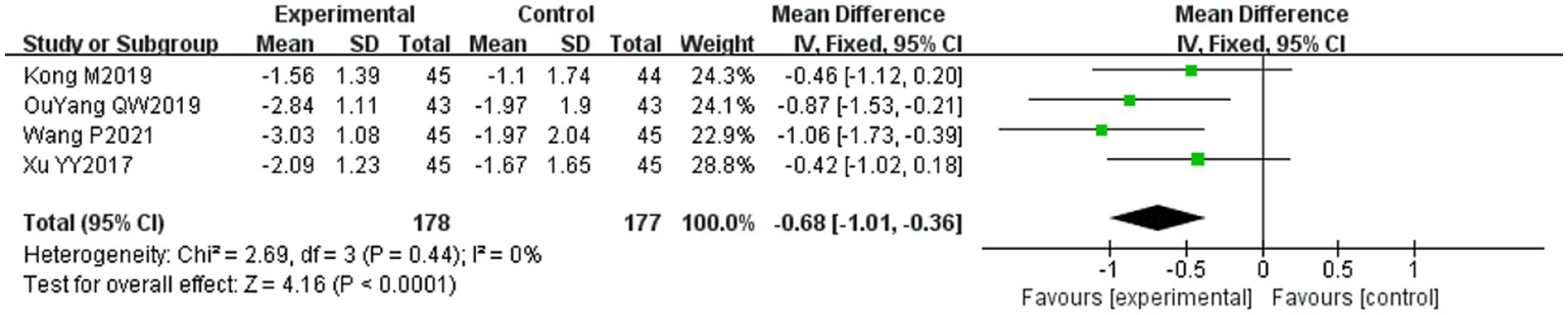 Four of the 36 included literature (31, 34, 43, 50) reported changes in the H-B facial nerve function grading before and after treatment of the study subjects, and a total of 355 patients were included. Only Ouyang QW2019 (50) scored the H-B facial nerve function grading, grade I is one point, grade II is two points, and so on, with a minimum of one point and a maximum of six points, and the higher the score indicates that the patient’s facial nerve function restoration effect is poorer, and the other three literature (31, 34, 43) described it in the way of hierarchical information, and scored the situation of the H-B facial nerve function grading in the other three literature by the same method and combined them for meta-analysis. Heterogeneity test: (I2 = 0%, p = 0.44), there was no statistically significant heterogeneity between the literature, visual assessment of the funnel plots demonstrated no significant publication bias (Figure 6C), and Egger’s test (p = 0.19) proved that no statistically significant publication bias was found. The results of the sensitivity analysis were robust (Figure 4C), using a fixed-effects model (Figure 9). Meta-analysis results showed (MD = −0.68, 95% CI [−1.01, −0.36], p < 0.001) a statistically significant difference in the difference in H-B facial nerve function grading scores between the experimental group and the control group, suggesting that the treatment of the experimental group was effective in reducing the H-B facial nerve function grading scores of the patients with PFP better than the control group.