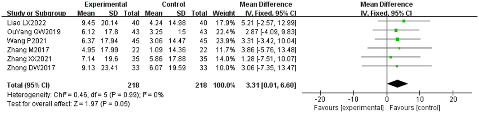 Six of the 36 included literature (20, 37, 43, 50–52) reported changes in FDIP scores before and after treatment of study participants, with a total of 436 patients included. Heterogeneity test: (I2 = 0%, p = 0.99), there was no statistically significant heterogeneity among the literature, visual assessment of the funnel plots indicated a slight publication bias (Figure 6D), and Egger’s test (p = 0.96) demonstrated that no statistically significant publication bias was found. The results of the sensitivity analyses were robust (Figure 4D). Using a fixed-effects model (Figure 10), the meta-analysis results demonstrated a statistically significant difference in the FDIP score changes between the experimental and control groups (MD = 3.31, 95% CI [0.01, 6.60], p = 0.05), indicating that the experimental group exhibited superior efficacy in improving FDIP scores among patients with PFP compared to the control group. Subgroup analysis showed that there was no statistical significance in any of the groups (Table 3).