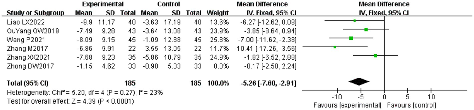 Six of the 36 included papers (20, 37, 43, 50–52) reported changes in FDIP scores before and after treatment of the study participants, and a total of 436 patients were included. Heterogeneity test: (I2 = 64%, p = 0.02), statistically high heterogeneity was observed among the literature, and visual assessment of the funnel plot indicated a slight publication bias (Figure 6E), but the Egger’s test (p = 0.47) proved that no statistically significant publication bias was found. Sensitivity analysis showed that this article, Zhong DW2017 (51), made the overall results of FDIS scores unstable (Figure 4E), and after removing this article, heterogeneity was found to be acceptable (I2 = 23%, p = 0.27), and the patients in this study had significantly lower pre-treatment FDIS scores compared to the other five studies, suggesting that the patients included in this study were better functioning in their social lives and had less severe disease, finding a source of heterogeneity. The study was excluded and a fixed-effect model was used (Figure 11). Meta-analysis showed (MD = −5.26, 95% CI [−7.60, −2.91], p < 0.001) that the difference in FDIS scores between the experimental group and the control group was statistically significant, indicating that the treatment of the experimental group was better than that of the control group in reducing the FDIS scores of patients with PFP. Subgroup analysis showed that: (1) Grouped by injection method: choosing the method of acupoint injection (MD = −3.81, 95% CI [−6.80, −0.82], p = 0.01), the treatment of the experimental group was superior to that of the control group in lowering the FDIS scores of patients with PFP. (2) Grouped by whether or not to cooperate with conventional drugs: without cooperating with the use of conventional drugs (MD = −4.26, 95% CI [−6.96, −1.55], p < 0.01), the treatment of the experimental group was superior to that of the control group in lowering the FDIS score of patients with PFP. The remaining subgroups were not statistically significant (Table 3).