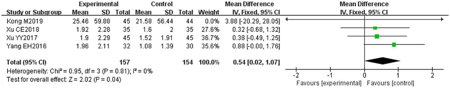 Four of the 36 included papers (31–34) reported changes in facial nerve conduction velocity before and after treatment in study participants, with a total of 311 patients included. Heterogeneity test: (I2 = 0%, p = 0.81), there was no statistically significant heterogeneity among the literature, visual assessment of funnel plots indicated a slight publication bias (Figure 6F), and Egger’s test (p = 0.19) demonstrated that no statistically significant publication bias was found. The results of the sensitivity analysis were robust (Figure 4F), and a fixed-effects model was chosen (Figure 12). The meta-analysis demonstrated a statistically significant difference in the enhancing of facial nerve conduction velocity between the experimental group and control group (MD = 0.54, 95% CI [0.02, 1.07], p = 0.04), indicating superior efficacy of the intervention of the experimental group in enhancing the facial nerve conduction velocity of patients with PFP compared to the control group.