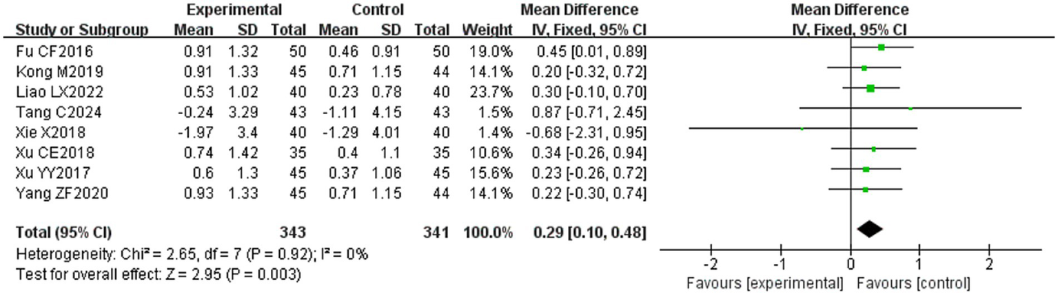 Eight (20, 23, 29, 31, 32, 34, 39, 53) of the 36 included papers reported changes in CMAP amplitude before and after treatment of the study subjects, and a total of 684 patients were included. Heterogeneity test: (I2 = 0%, p = 0.92), there was no statistically significant heterogeneity among the literature, visual assessment of the funnel plots indicated no significant publication bias (Figure 6G), and Egger’s test (p = 0.24) proved that no statistically significant publication bias was found. The results of the sensitivity analysis were robust (Figure 4G), and a fixed-effects model was chosen (Figure 13). The meta-analysis demonstrated a statistically significant difference in the changes of CMAP amplitude between the experimental and control groups (MD = 0.29, 95% CI [0.10, 0.48], p = 0.003), indicating that the intervention of experimental group was superior to the control intervention in improving CMAP amplitude among patients with PFP.
